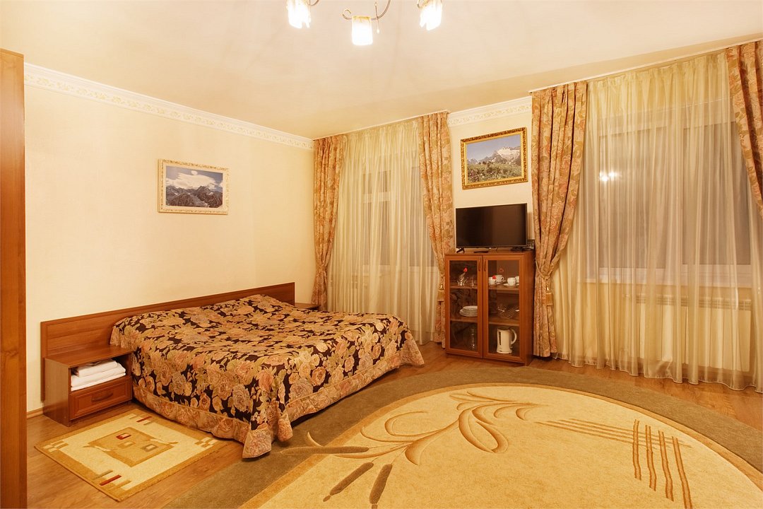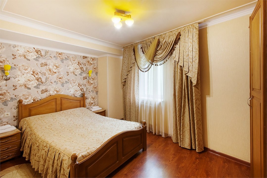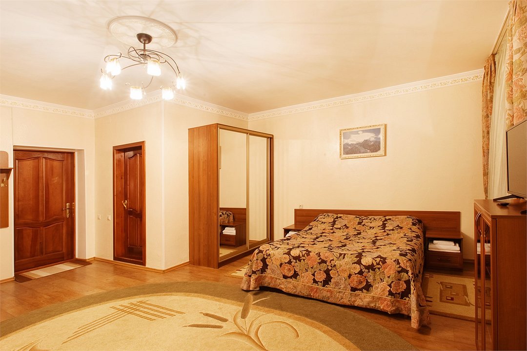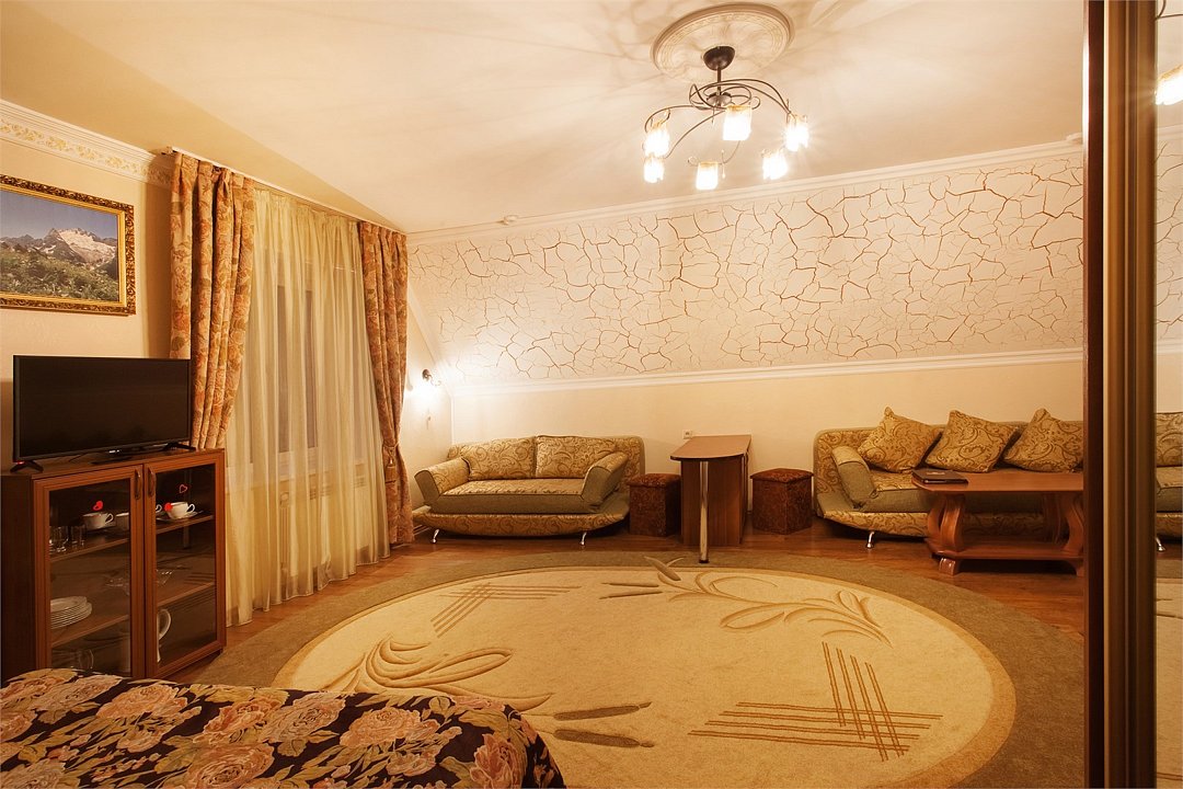 Комфортабельный номер Люкс площадью 58 кв.м с балконом оснащен ЖК-телевизором со спутниковыми каналами и телефоном. Номер разделен на две спальные и гостиную зону. К вашим услугам сейф. Меблировка включает мягкий уголок и гардеробный шкаф. В ванных комнатах вы найдете фен, халат, тапочки и туалетные принадлежности.Услуги и удобства