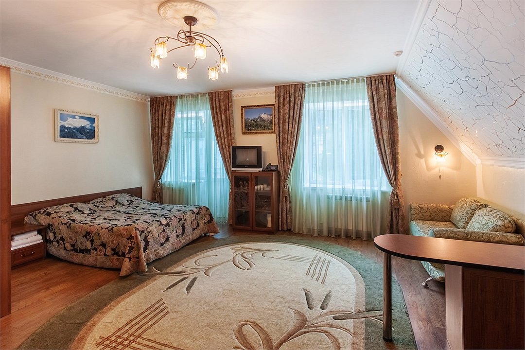 телевизор, Wi-Fi, холодильник, фен, ванная комната, санузел, халаты, тапочки, косметические средства, балкон, двуспальная кровать, диван, вешалки, журнальный столик, пуфики, ковер, чайный набор, набор посуды, сейф, чайник, унитаз, вид на реку, ламинат, стаканы, столовые приборы, туалет, диван-кровать, внутренний телефон, телевизор с плоским экраном, москитная сетка, вид на горы, вид на лес, угловой диван-кроватьВ гостиничном номере