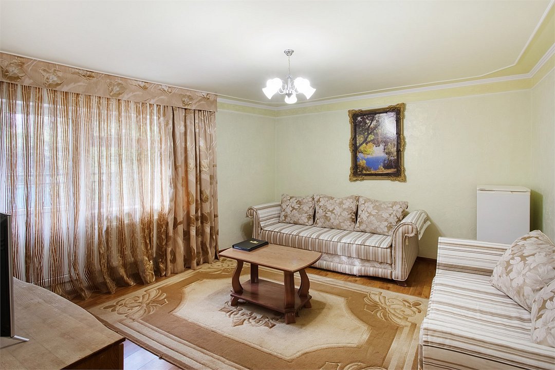 Wi-Fi, холодильник, фен, ванна, санузел, косметические средства, двуспальная кровать, диван, шкаф для одежды, вешалки, журнальный столик, пуфики, две комнаты, сейф, чайник, раковина, кресло, вид во двор, ламинат, стаканы, стул, диван-кровать, телевизор с плоским экраномВ гостиничном номере