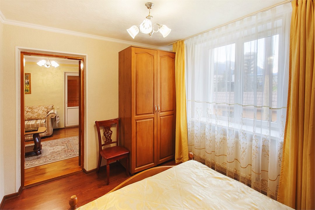 два телевизора, спутниковое телевидение, Wi-Fi, холодильник, фен, ванная комната, банные полотенца, тапочки, косметические средства, балкон, двуспальная кровать, шкаф для одежды, вешалки, журнальный столик, пуфики, ковер, две комнаты, чайный набор, набор посуды, сейф, чайник, раковина, мягкая мебель, гостиная зона, вид на реку, ламинат, стаканы, столовые приборы, туалет, раскладной диван, внутренний телефон, телевизор с плоским экраном, москитная сетка, вид на горы, номер для некурящихВ гостиничном номере