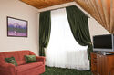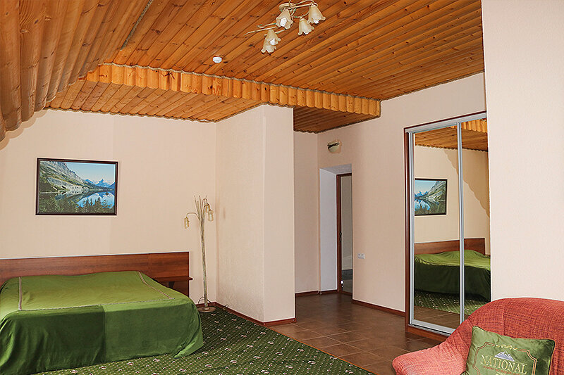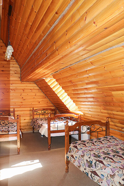 Трехместный мансардный стандарт (18 квм) подойдет для не прихотливых путешественников, которые предпочитают простую и уютную атмосферу загородного дома. В номере есть все необходимое для отдыха: три полуторные кровати, гардеробный шкаф, чайник, мини-холодильник. Предоставляются предметы гигиены (зубной набор, шампунь, гель для душа) и полотенца. Ванная комната расположена на мансардном этаже.