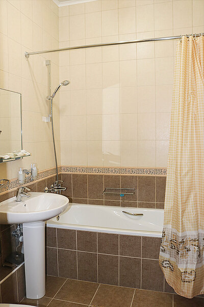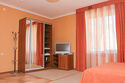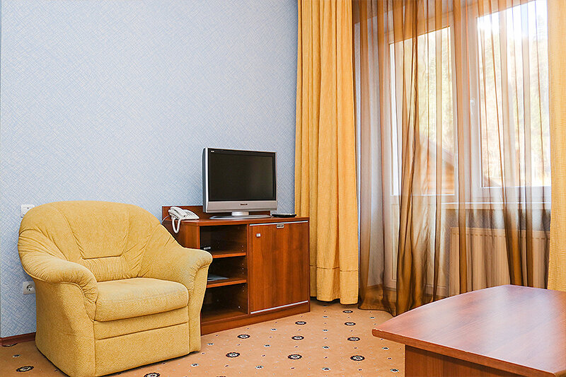 Спальная комната: двуспальная кровать, шкаф для одежды, диван, кресло, журнальный столик, два стула. Бытовая техника: ЖК-телевизор (спутниковое подключение, 15 каналов), мини бар, фен.