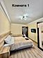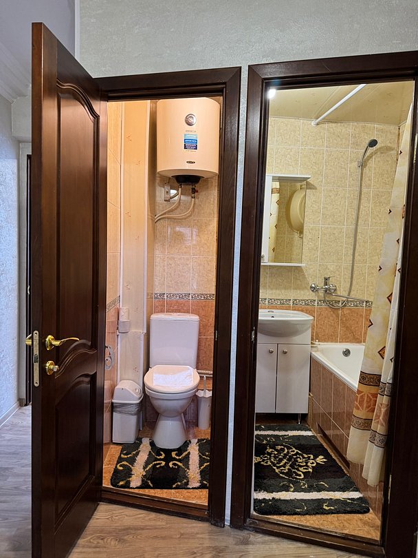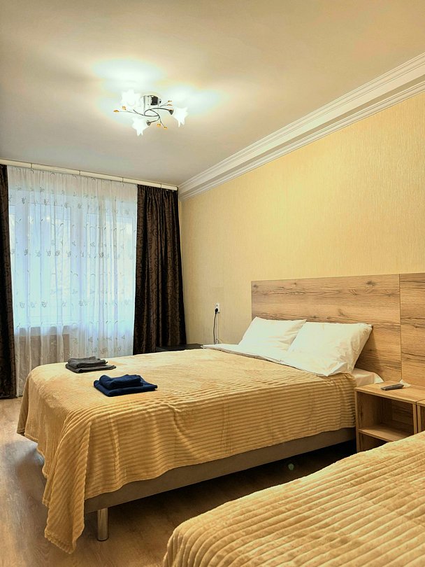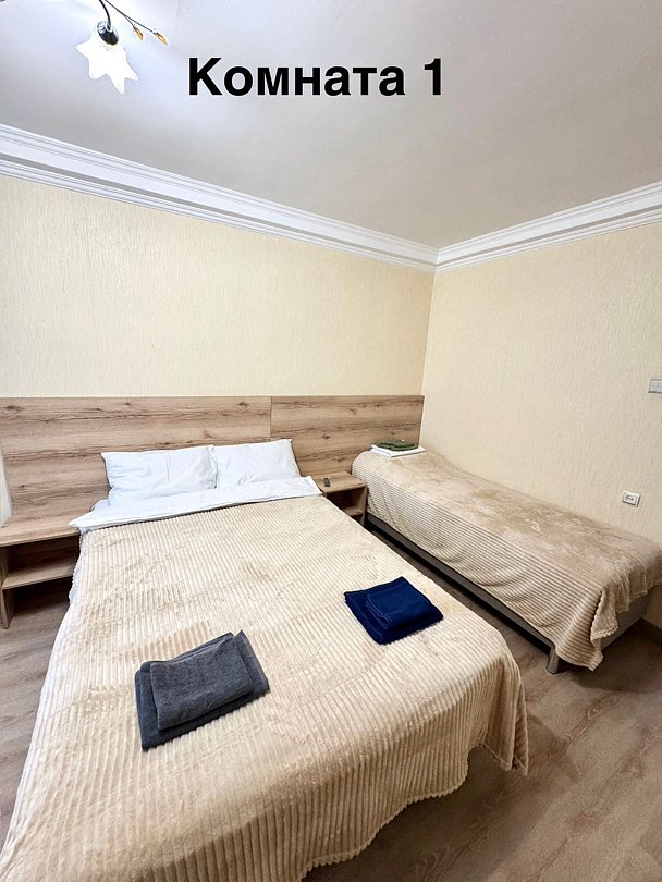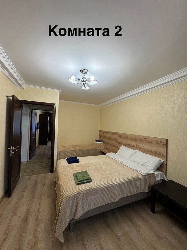 Две изолированные комнаты: в каждой комнате по 2 кровати, ТВ-цифровое, wi-fi, диван, санузел (душевой поддон), мини-кухня с посудой, газовая печь, микроволновка, эл.чайник, холодильник, стол.