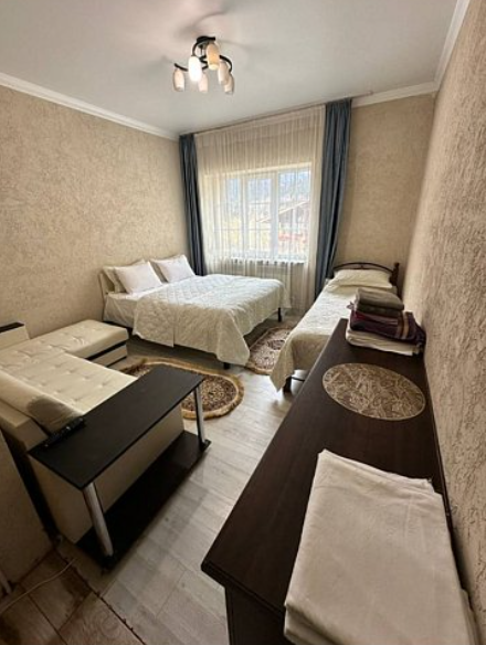 Номер оснащен: двуспальная кровать + 2 односпальные кровати, прикроватные тумбочки, стол, шкаф, ТВ, холодильник.