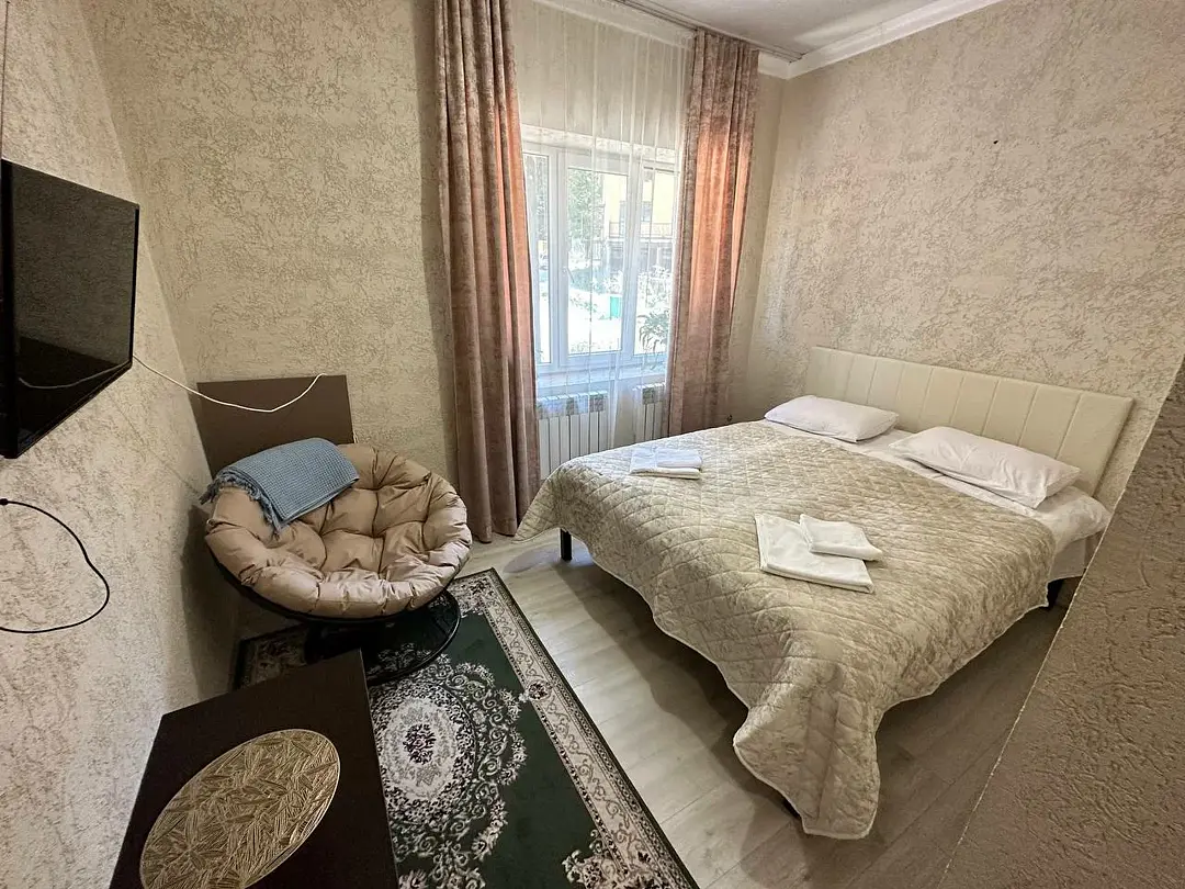Номер оснащен: двуспальная кровать, прикроватные тумбочки, ТВ, холодильник, диван или кресло.