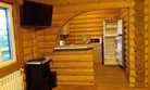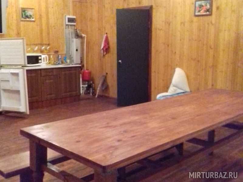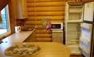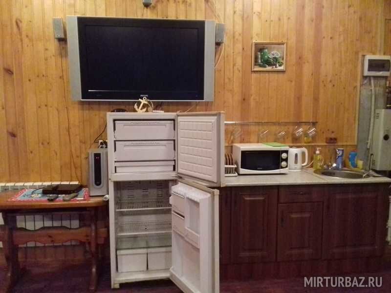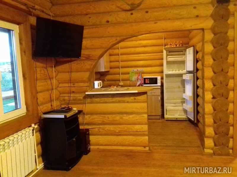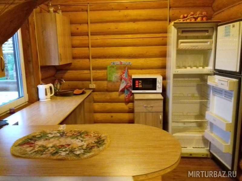 Уютная кухня с набором посуды (холодильник, плита). В холодное время года, в домиках постоянно работает отопление. Арендуя домик осенью или зимой, Вы можете быть уверены в том, что Вам будет комфортно.