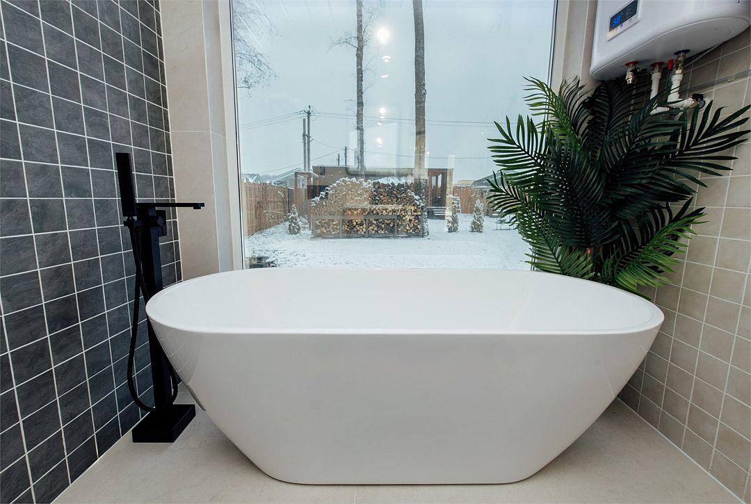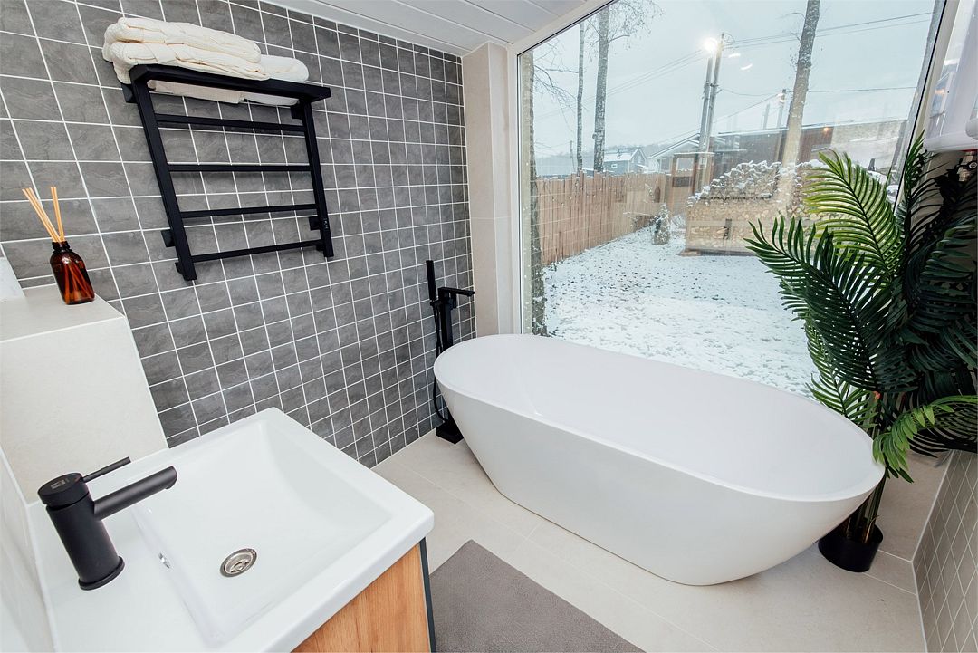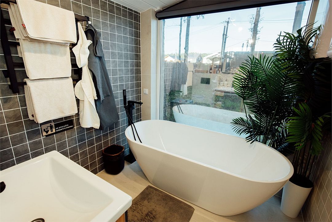 Отдельно стоящая ванна с панорамным видом скрасит вечер. Вода прошла три этапа очистки, поэтому в ванной доступна чистейшая, прозрачная, теплая вода.