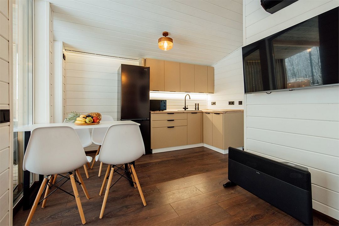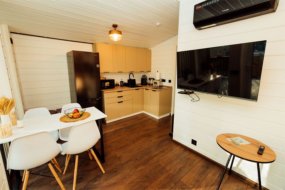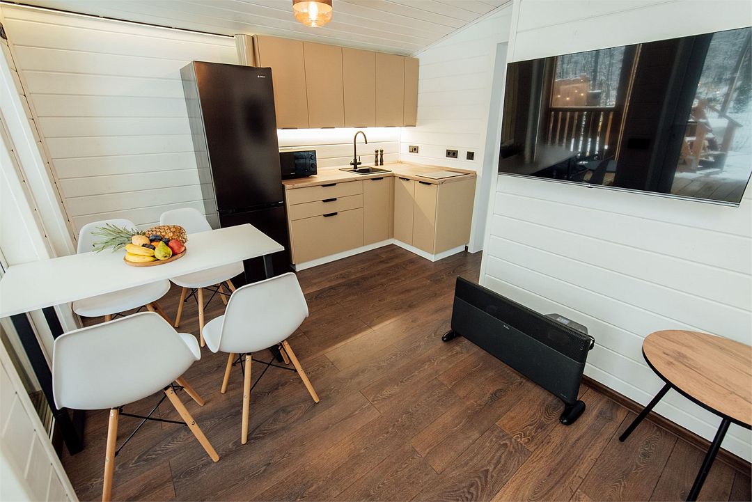 Для максимального комфорта на кухне есть вкусный ароматный чай, кофе, мед и сахар, также в домике доступны настольные игры, система караоке, а телевизор предлагает все сериалы и новинки в открытом доступе.