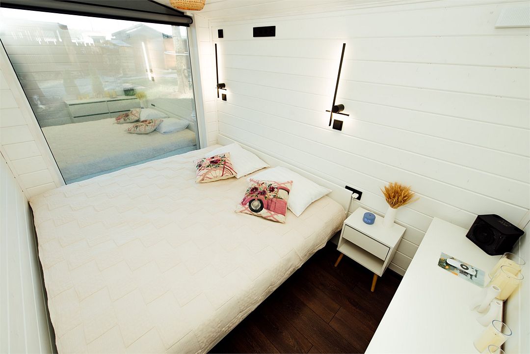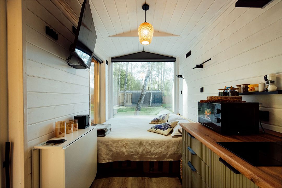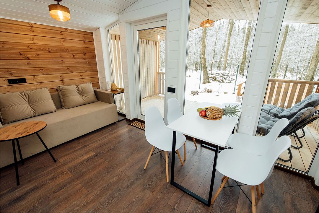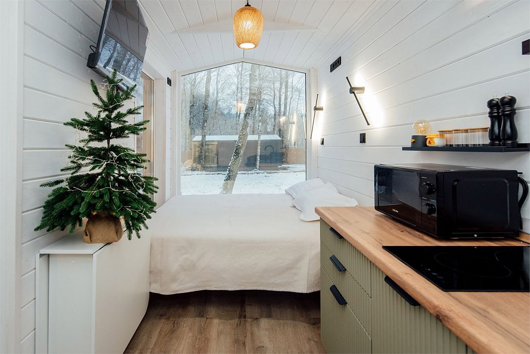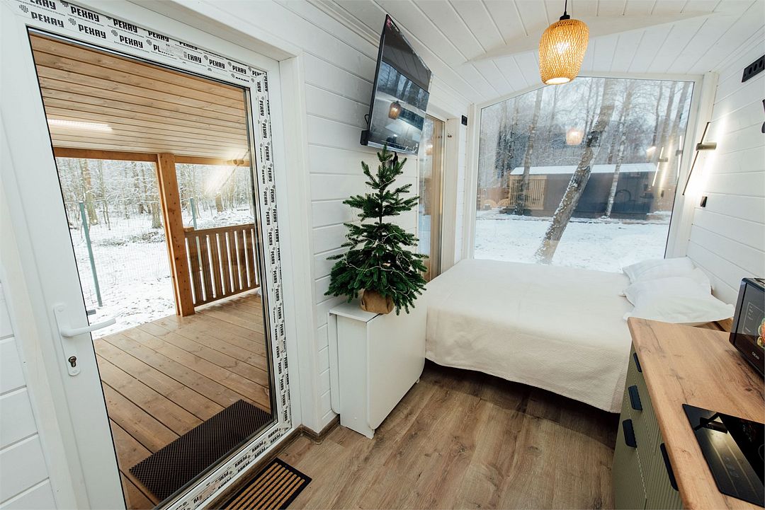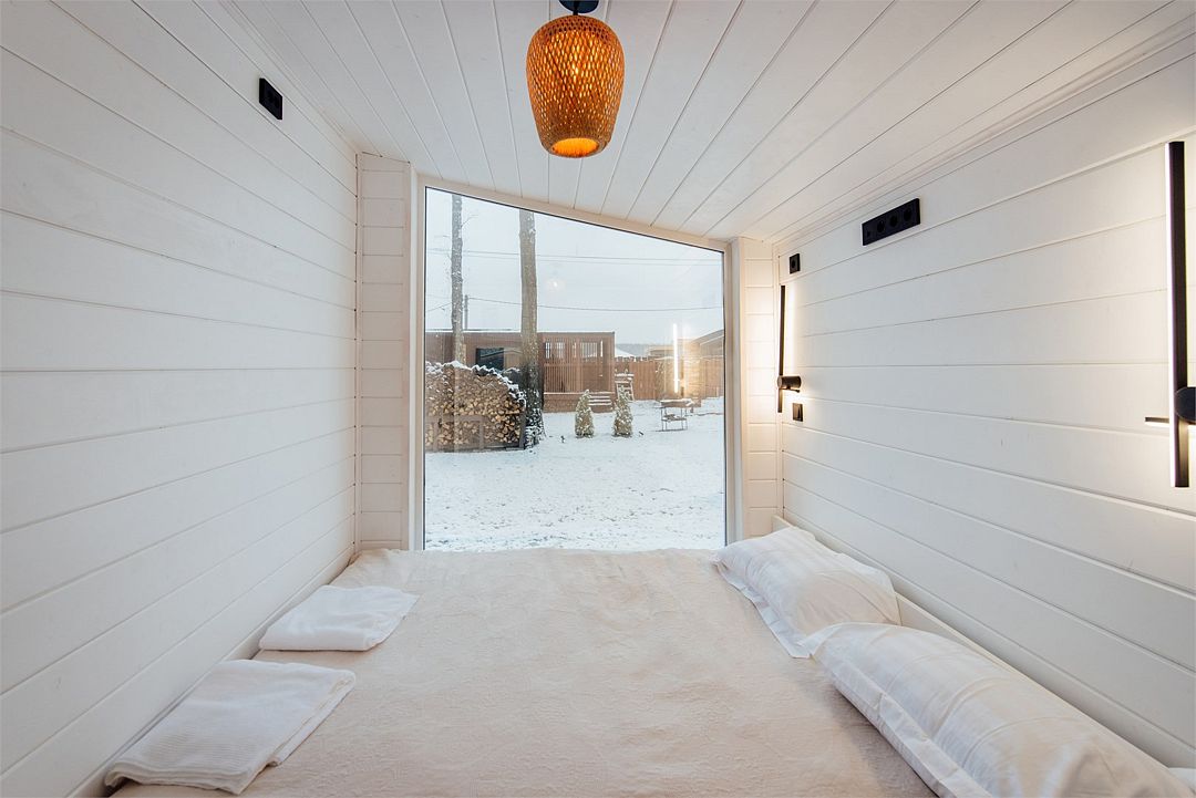 Дом создан для семейного отдыха с комфортным размещением для четырех человек. В доме есть отдельная спальня с большой уютной кроватью и панорамным окном, а в гостиной расположен раскладной диван.