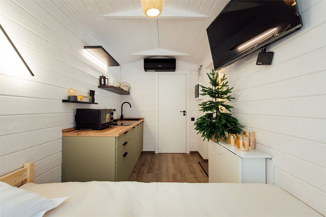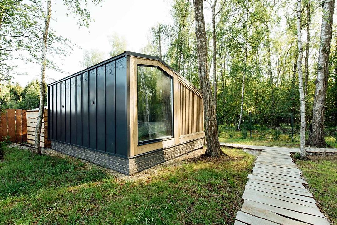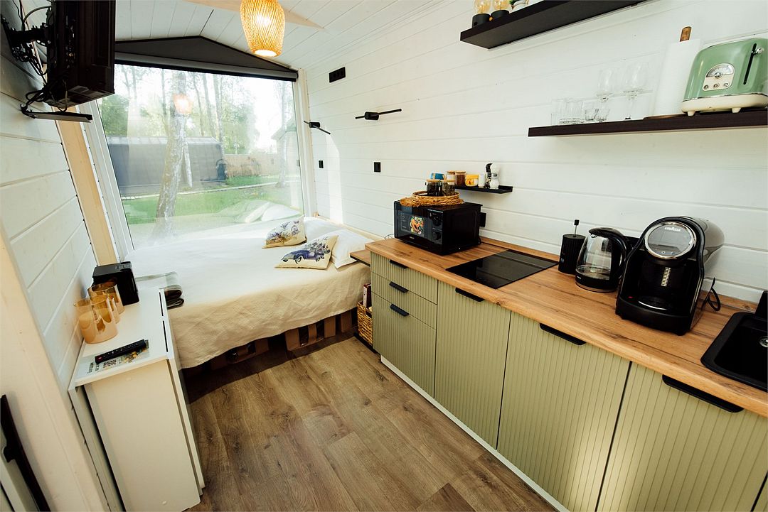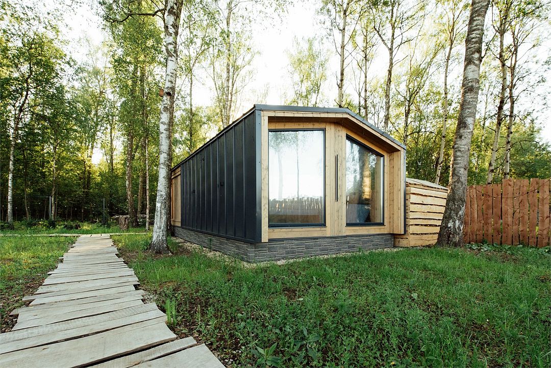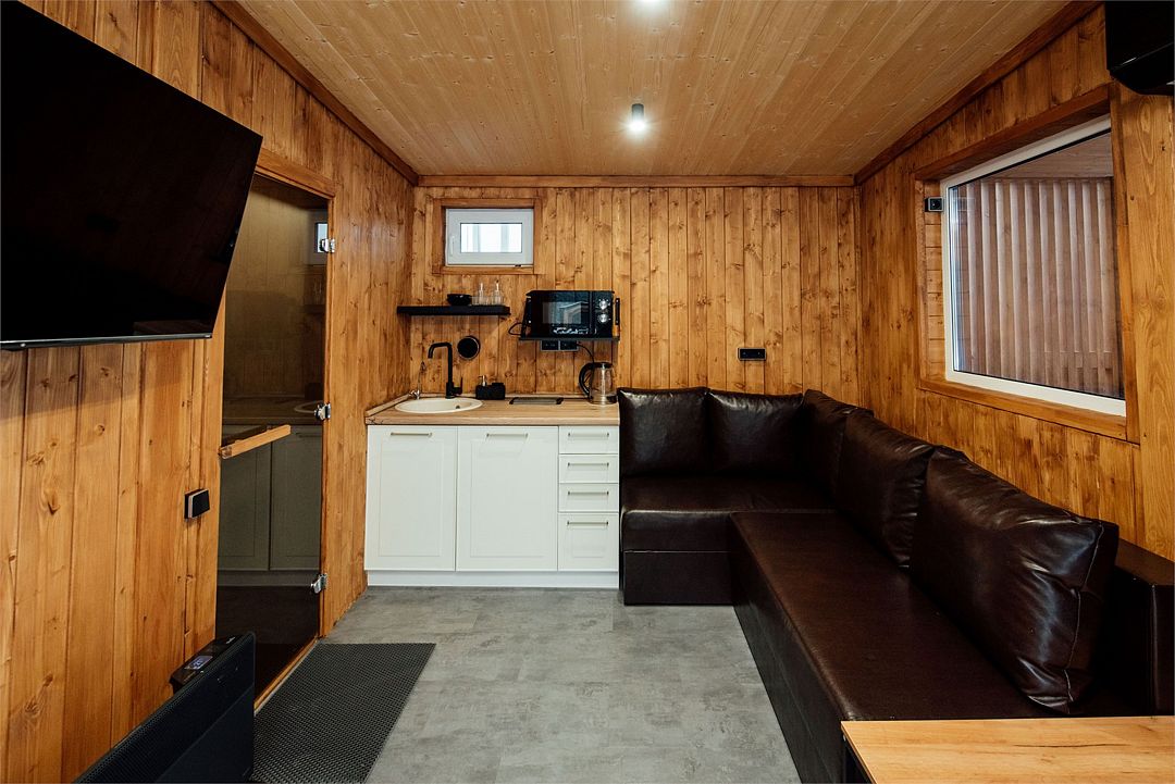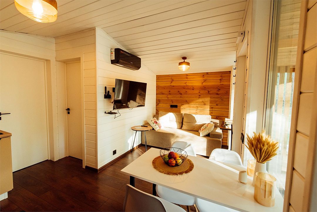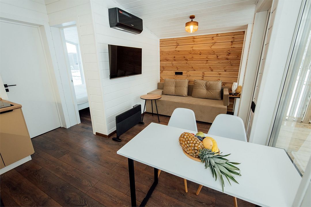 Дом создан для семейного отдыха с комфортным размещением для четырех человек. В доме есть отдельная спальня с большой уютной кроватью и панорамным окном, а в гостиной расположен раскладной диван.