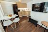 В комнате отдыха есть небольшая кухня и раскладной диван. После парения можно ополоснуть себя ледяной водой из ведра или же окунуться в ледяную купель, которая находится на террасе.