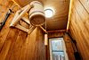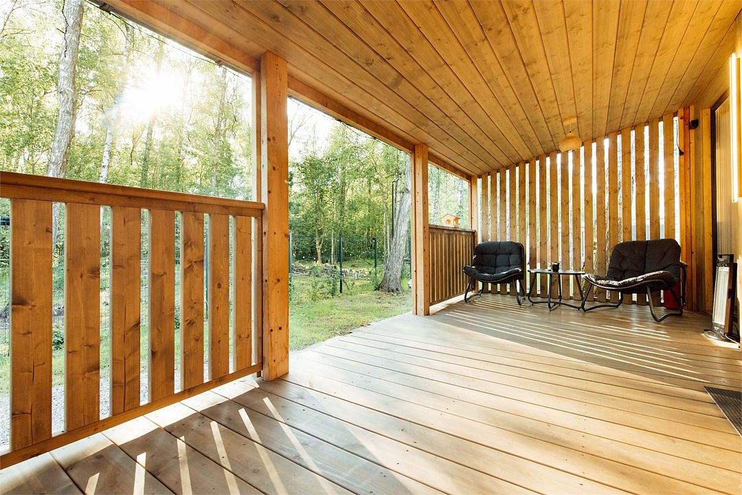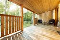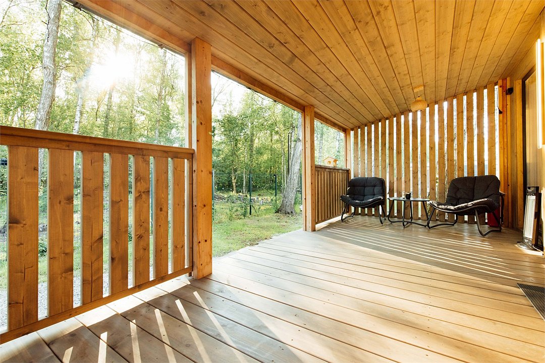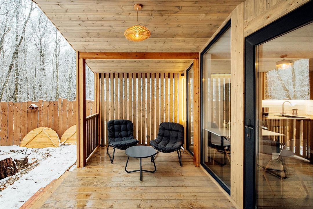 Вместимость домика — один–четыре человека. Размер дома — тридцать квадратных метров. Открытая терраса с уличной мягкой мебелью и с видом на лес — десять квадратных метров.