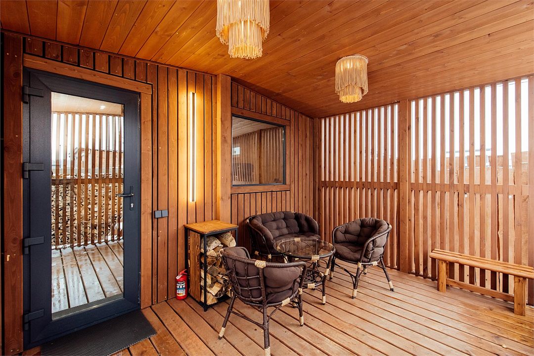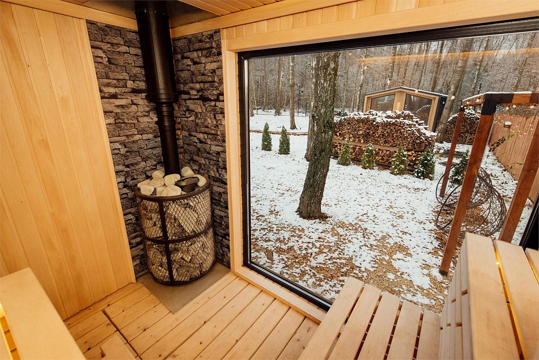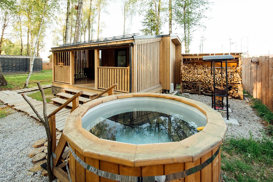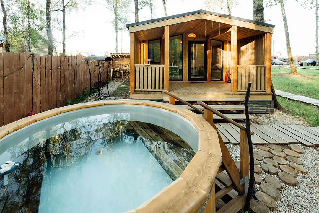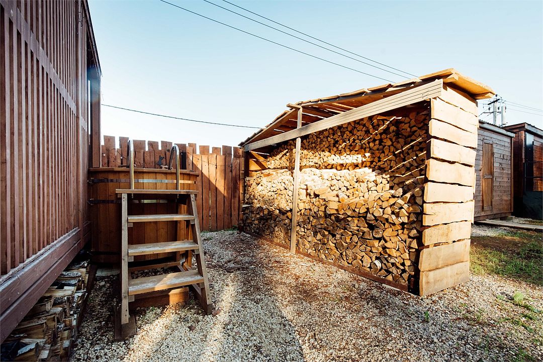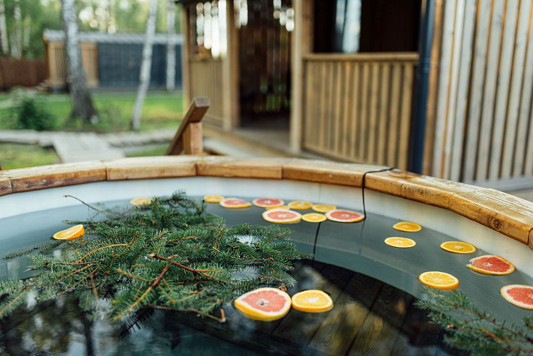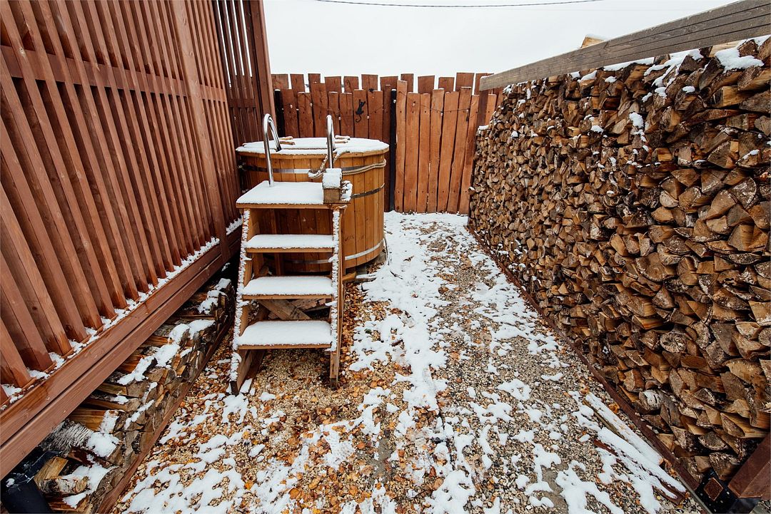 Рядом с каждым домом гостей ожидает изысканная дровяная купель Фурако, где вода, прогретая до 39-40°C, приглашает к неспешному отдыху и релаксации. Здесь можно выбрать между классическими вариантами и более утонченными решениями, обогащенными ароматными травами и натуральными ингредиентами.