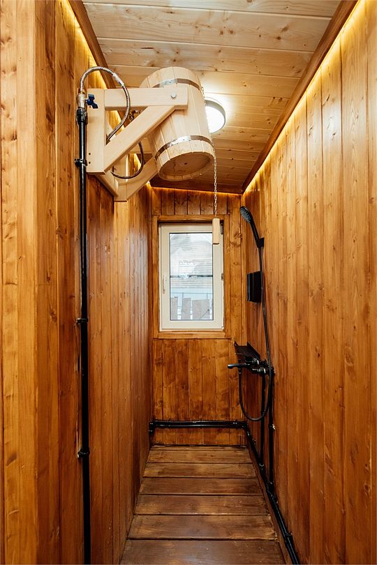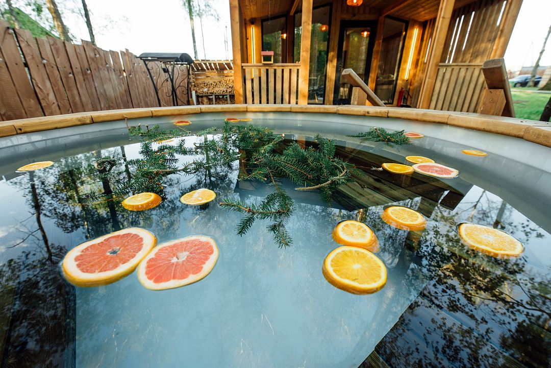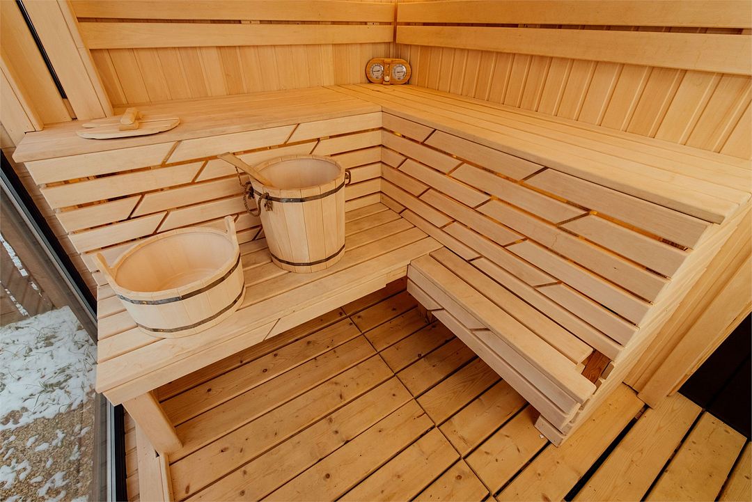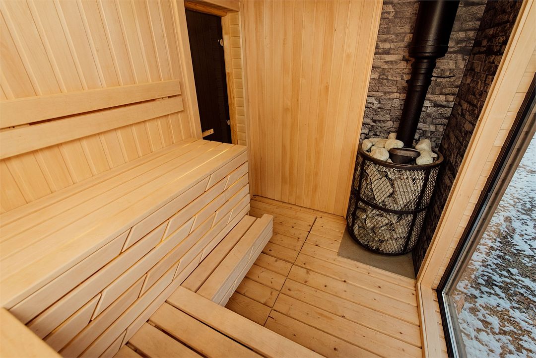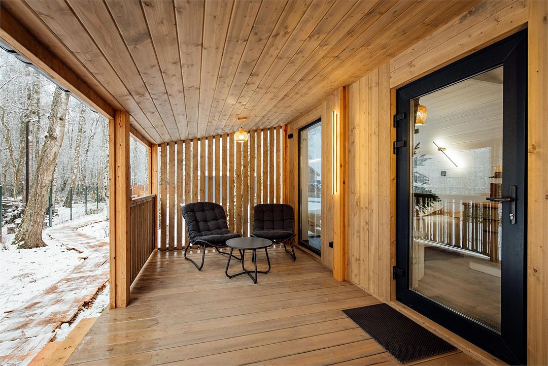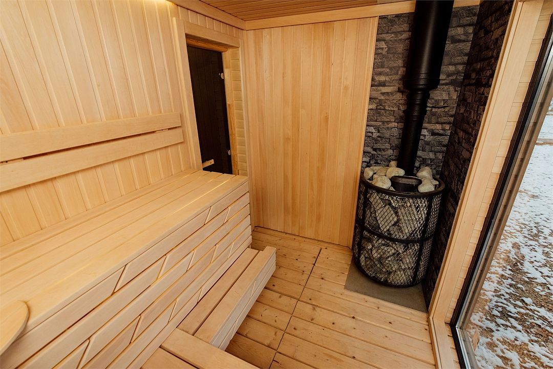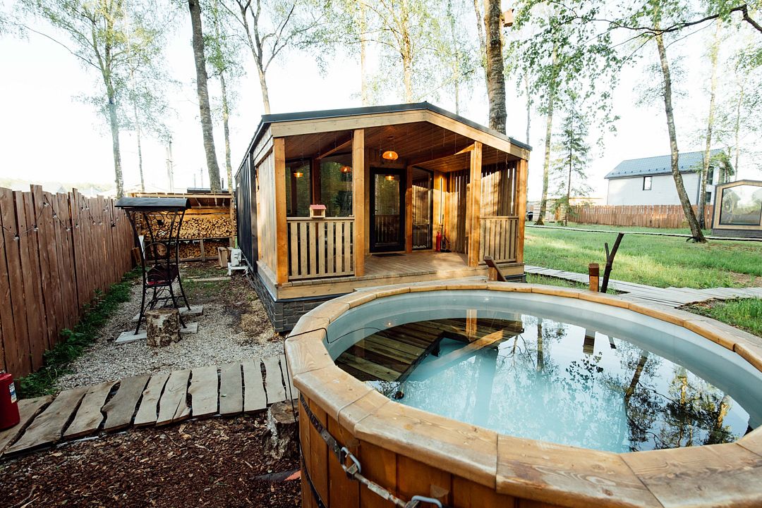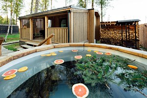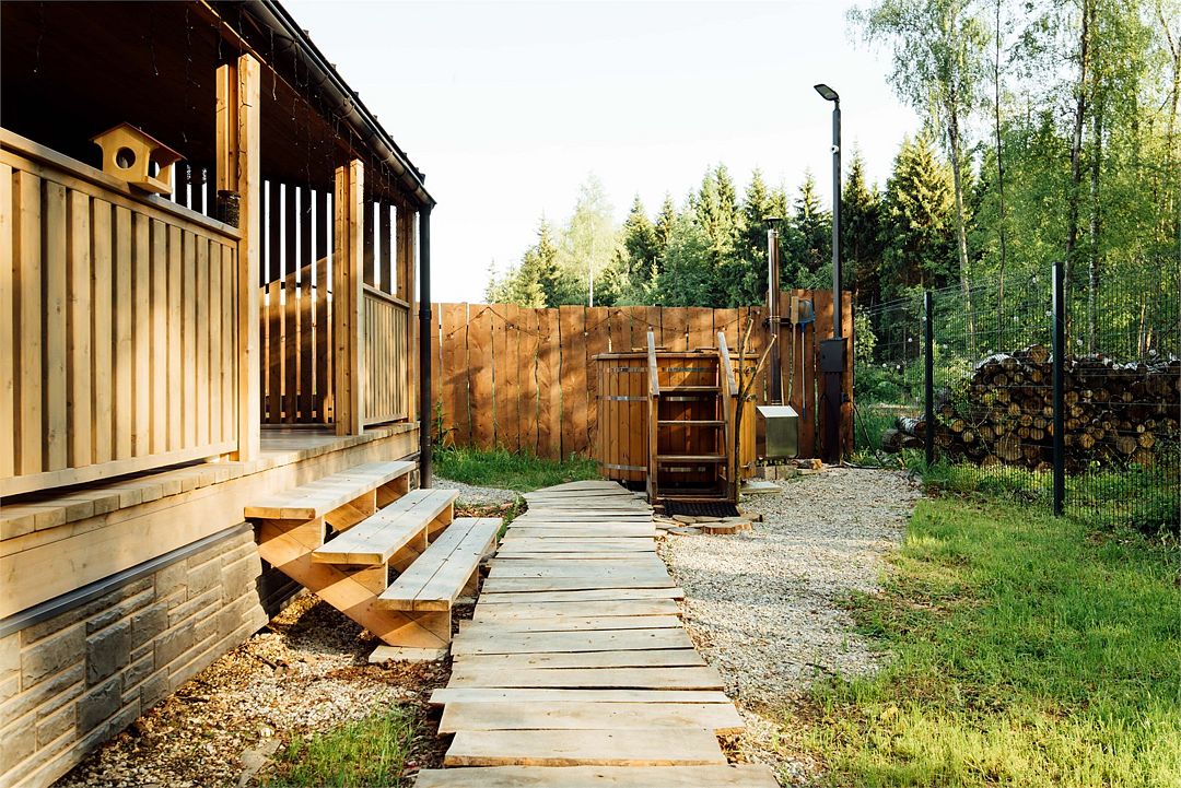 Рядом с каждым домом гостей ожидает изысканная дровяная купель Фурако, где вода, прогретая до 39-40°C, приглашает к неспешному отдыху и релаксации. Здесь можно выбрать между классическими вариантами и более утонченными решениями, обогащенными ароматными травами и натуральными ингредиентами.