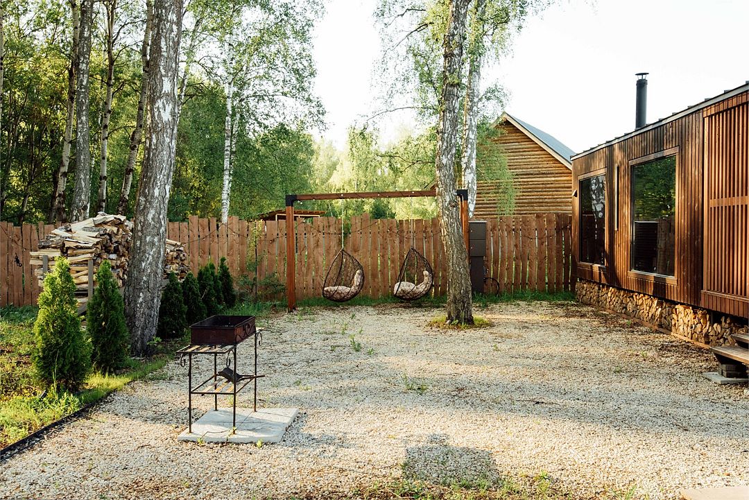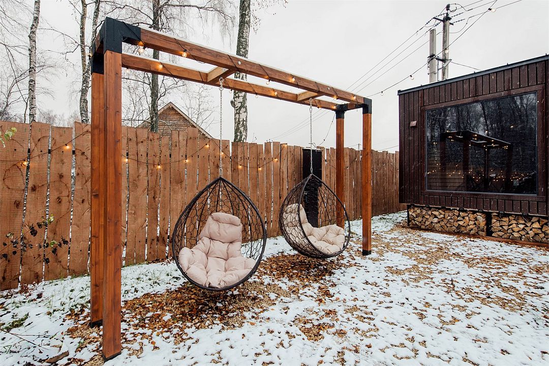 На территории домика есть мягкие подвесные качели, мангальная зона и терраса с мягкой мебелью.