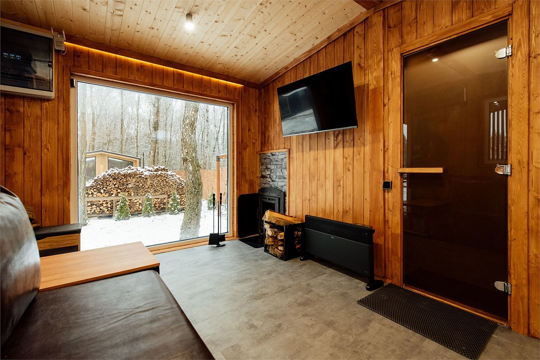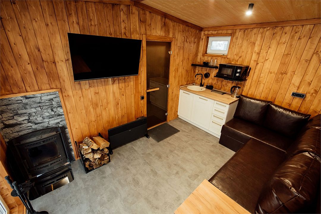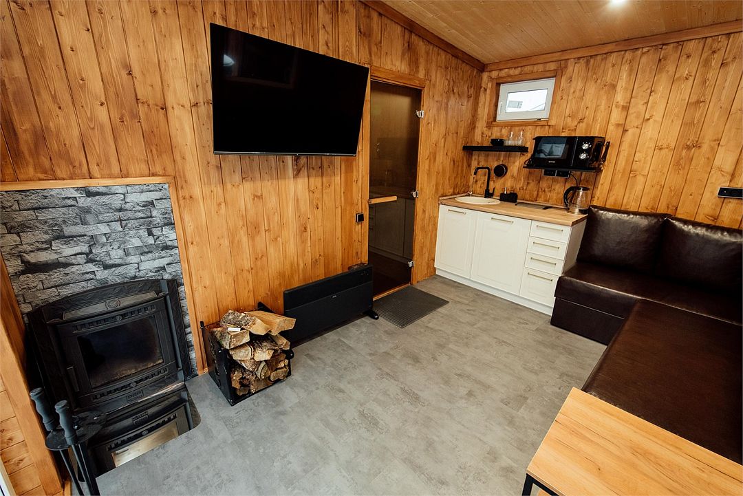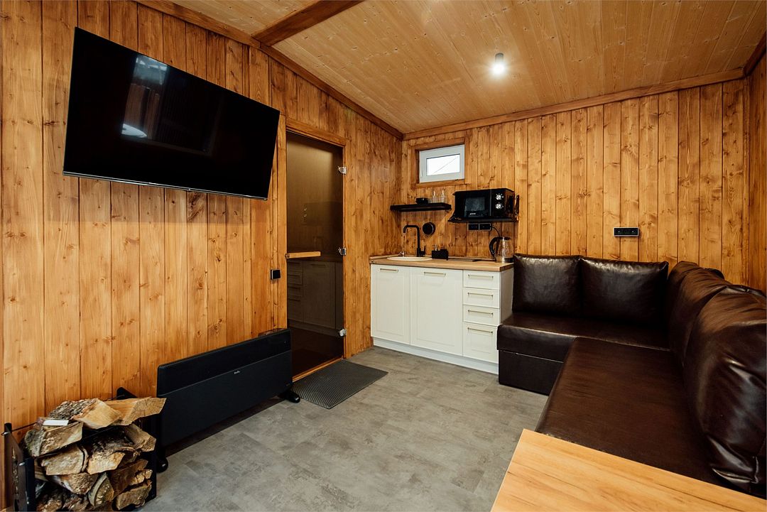 Русская баня на дровах предлагает погрузиться в мир ароматерапии и насладиться парением. Внутри бани есть уютная зона отдыха с телевизором, диваном и мини-кухней, где можно отдохнуть и расслабиться.