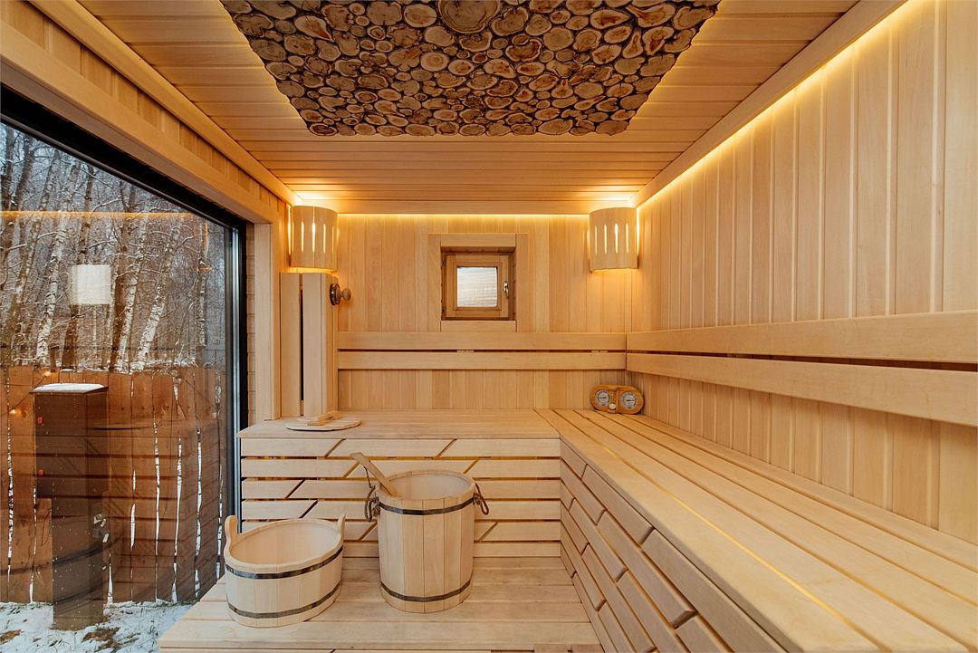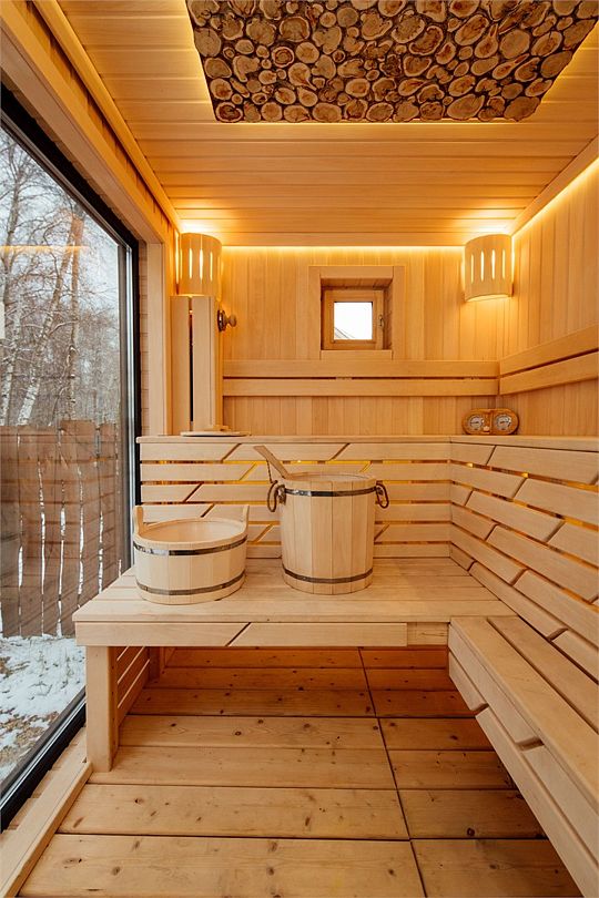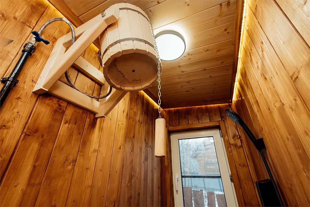 После посещения парной вентилятор освежает воздух, а ледяная купель на террасе помогает охладиться и дарит ощущение гармонии и свежести.