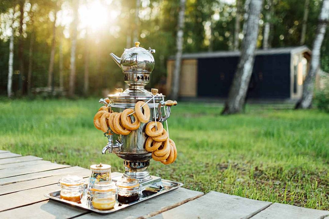 В глэмпинге предлагают насладиться ароматным травяным чаем, приготовленным в аутентичном самоваре, а также полакомиться сладостями, которые сделают отдых еще более приятным и комфортным.