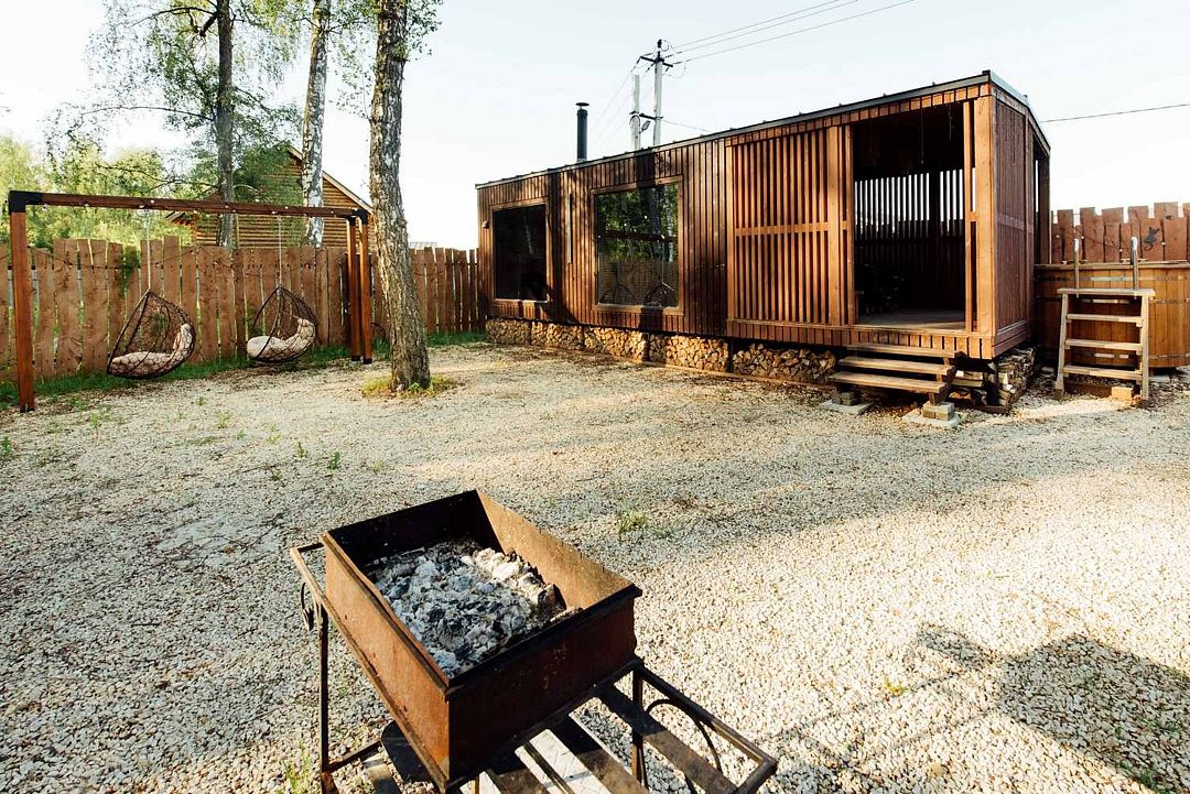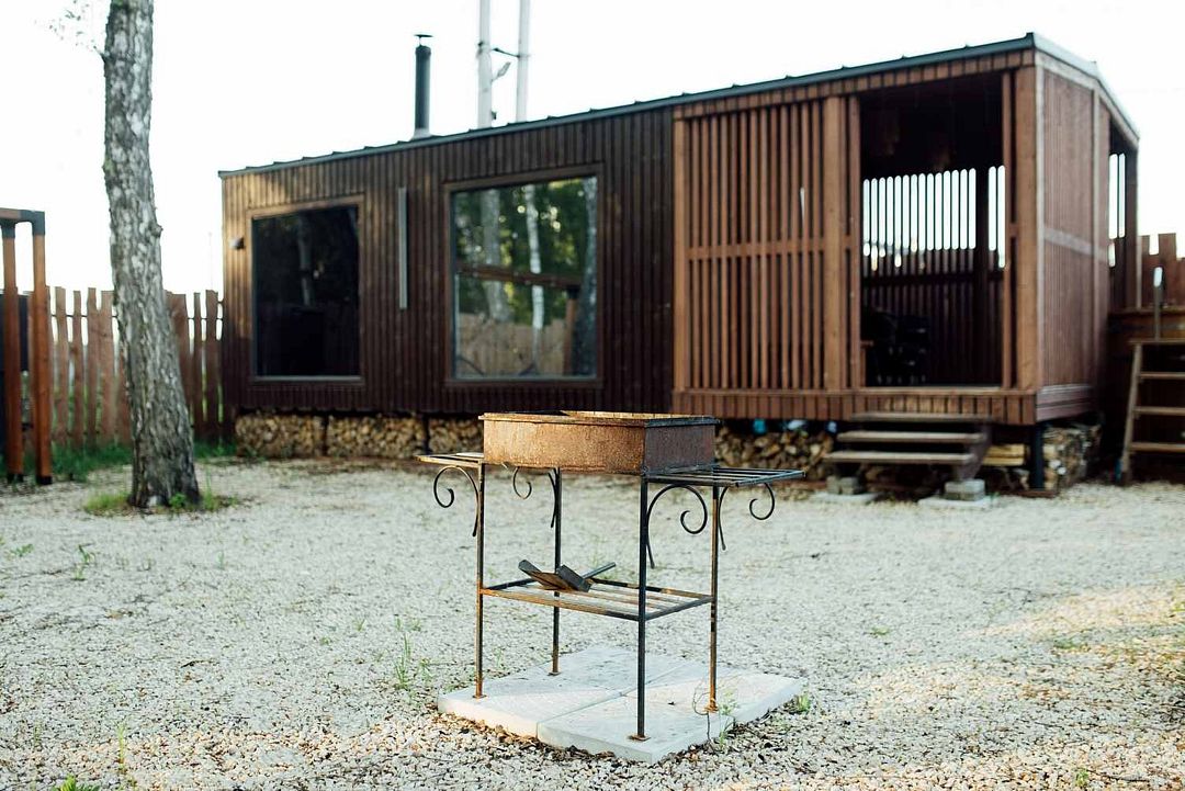 В доме большая кровать и панорамные окна, из которых открывается вид на лес — просыпаешься, и перед глазами чистейшее небо и зелень леса! Также есть кухня с самым необходимым, а на улице расположена мангальная зона, где можно приготовить вкуснейший ужин и наслаждаться им за просмотром любимого сериала.