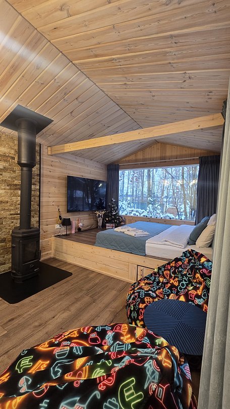 Домик с просторной гостиной с панорамными окнами и отдельной уютной спальней с видом на природу! С камином и удобным диваном!
