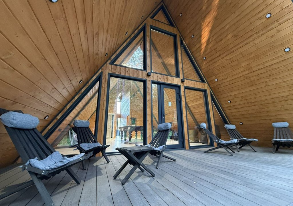 На территории: баня с бильярдом в стиле А-фрейм площадью 120 кв. м, арендуется за дополнительную плату.