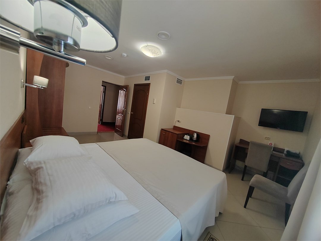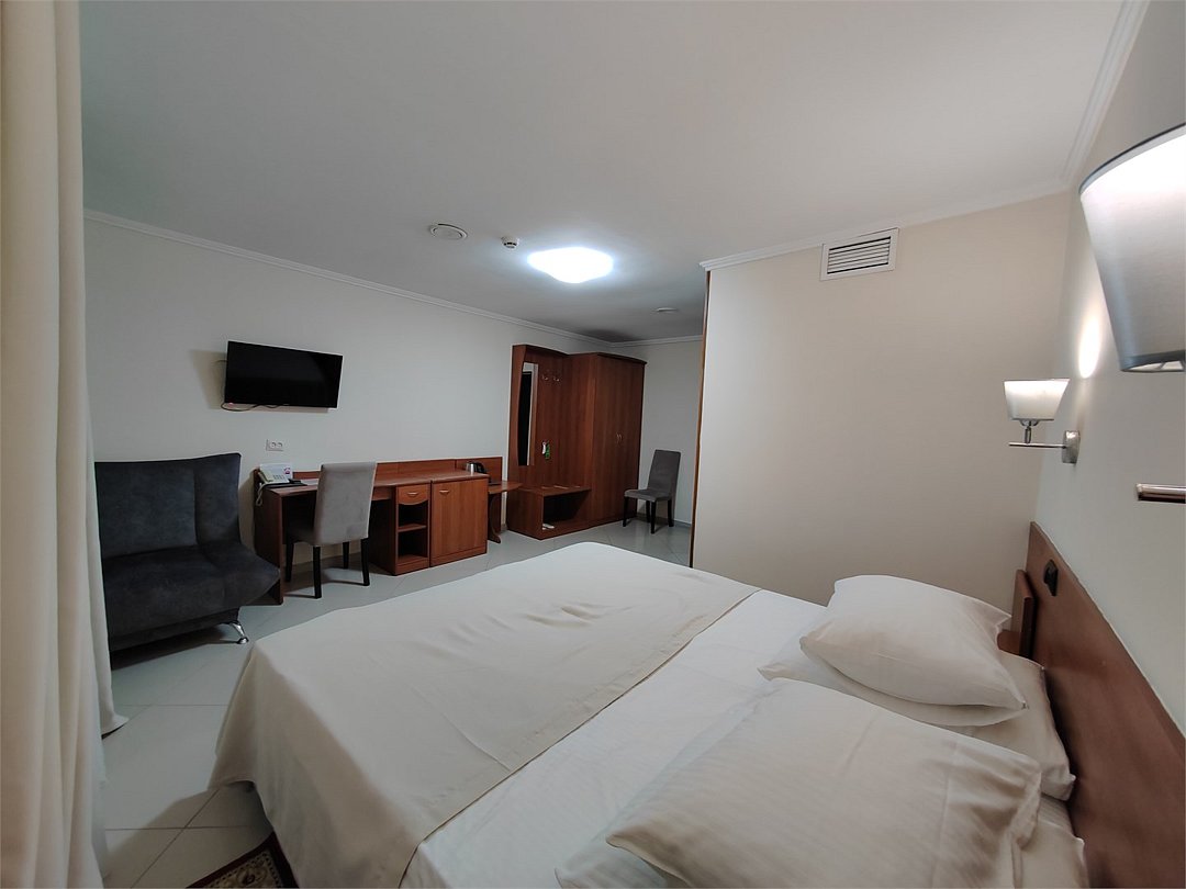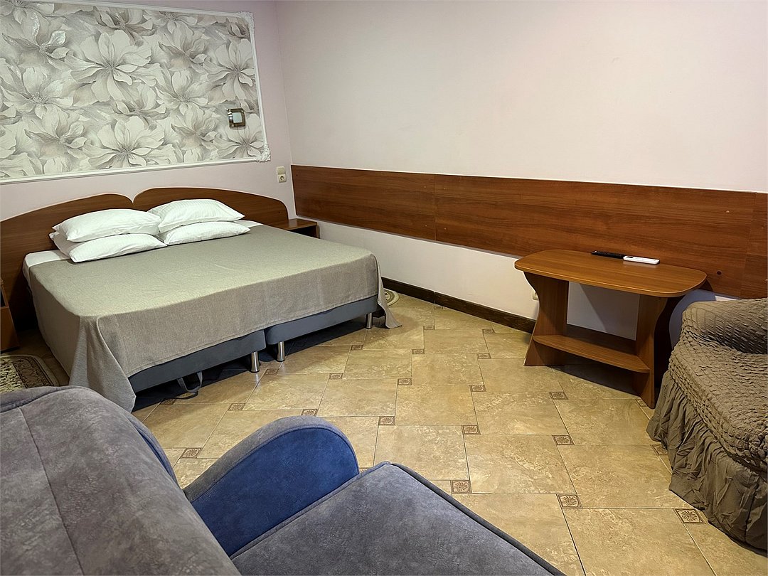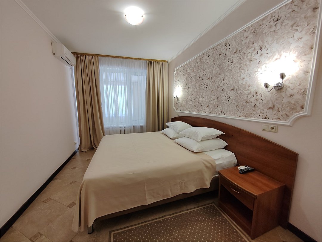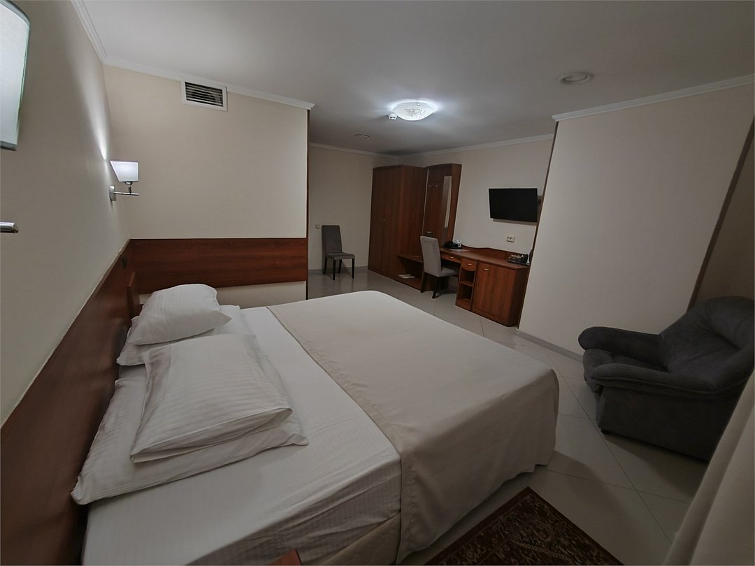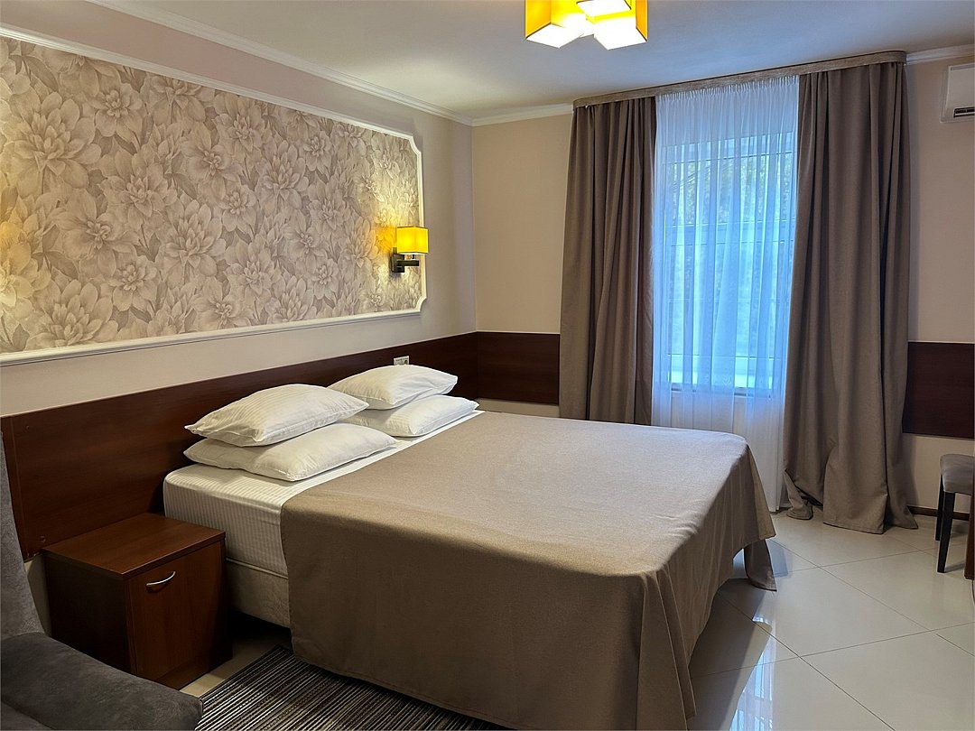 Вместимость: до 3 гостей (2 на основных местах + 1 на дополнительном месте) Просторный, однокомнатный или двух комнатный номер с двухспальной кроватью оформленный в современном стиле, со всеми удобствами для полноценного и комфортного отдыха. Система кондиционирования воздуха Современная противопожарная система Шкаф Телефон Бесплатный Wi-Fi доступ в интернет Ванная Комплект полотенец Косметические принадлежности Фен Холодильник Шторы для полного затемненияУслуги и удобства