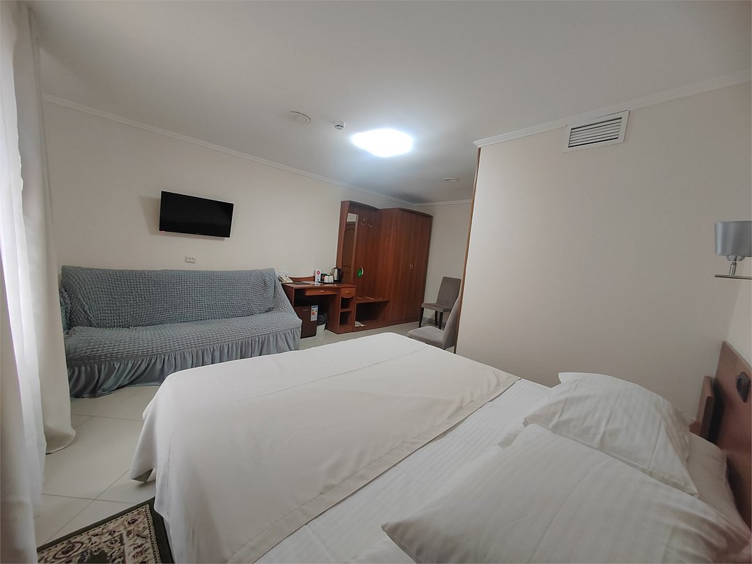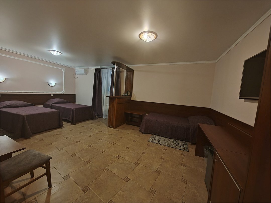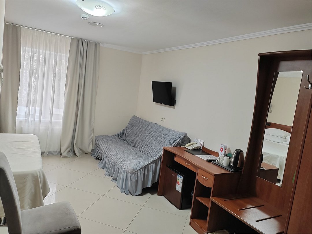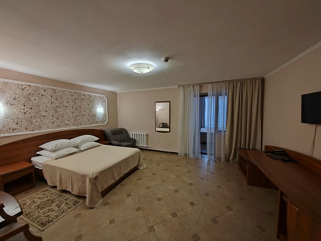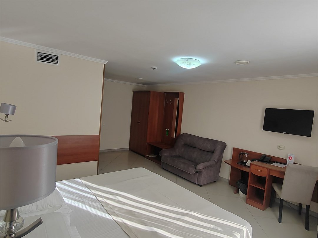 Вместимость: до 3 гостей (2 на основных местах + 1 на дополнительном месте) Просторный, однокомнатный или двух комнатный номер с двухспальной кроватью оформленный в современном стиле, со всеми удобствами для полноценного и комфортного отдыха. Система кондиционирования воздуха Современная противопожарная система Шкаф Телефон Бесплатный Wi-Fi доступ в интернет Ванная Комплект полотенец Косметические принадлежности Фен Холодильник Шторы для полного затемненияУслуги и удобства