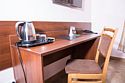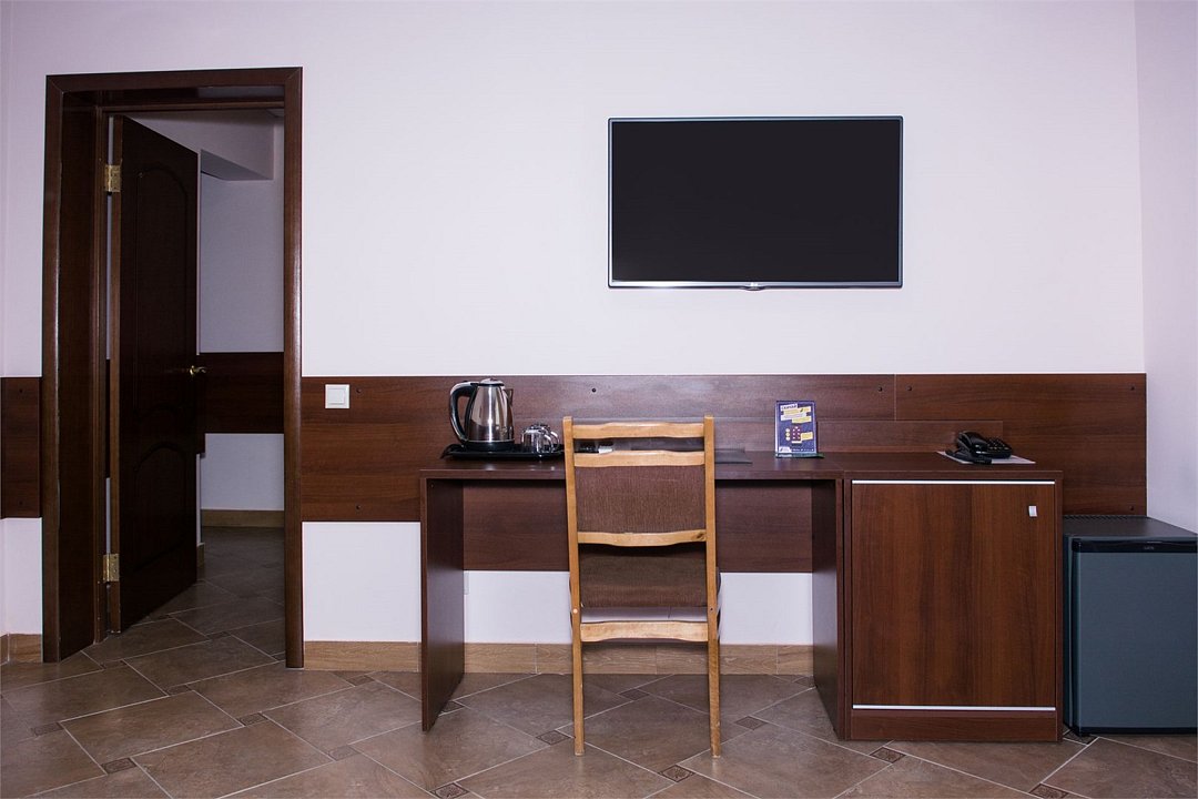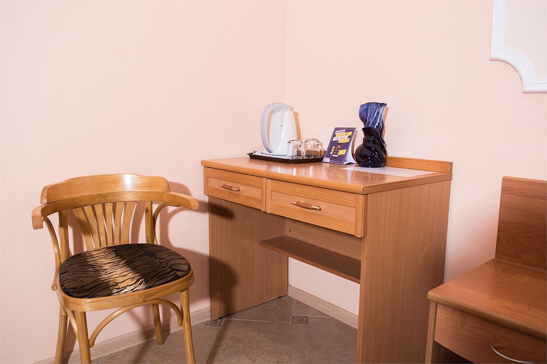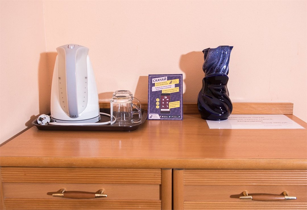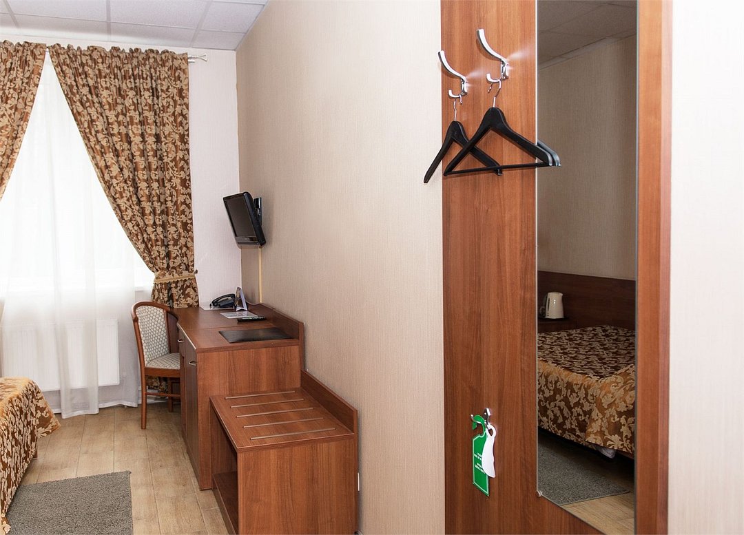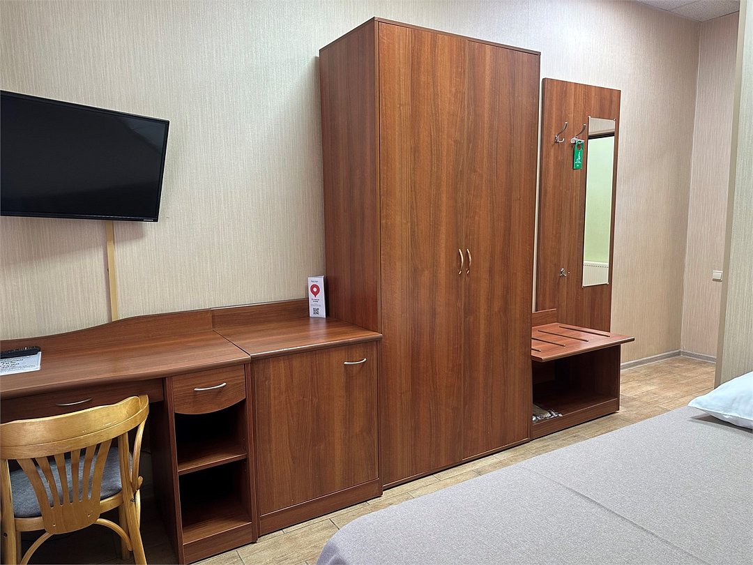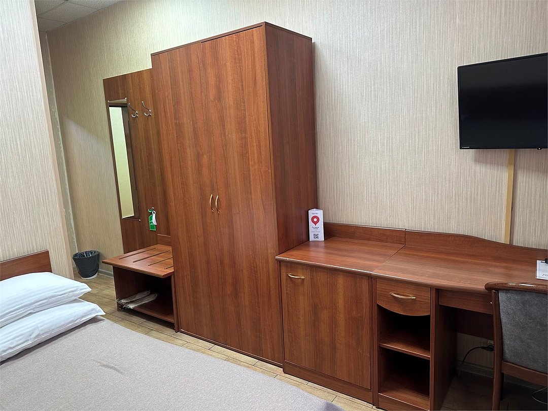 кабельное телевидение, Wi-Fi, фен, электронные замки, ванная комната, ванна, санузел, тапочки, односпальная кровать, шкаф для одежды, вешалки, письменный стол, багажная тумба, зеркало, обслуживание номеров, чайник, раковина, кулер на этаже, вид во двор, стаканы, столовые приборы, стул, тумба, туалетные средства, внутренний телефон, мини-холодильник, можно с питомцамиВ номере