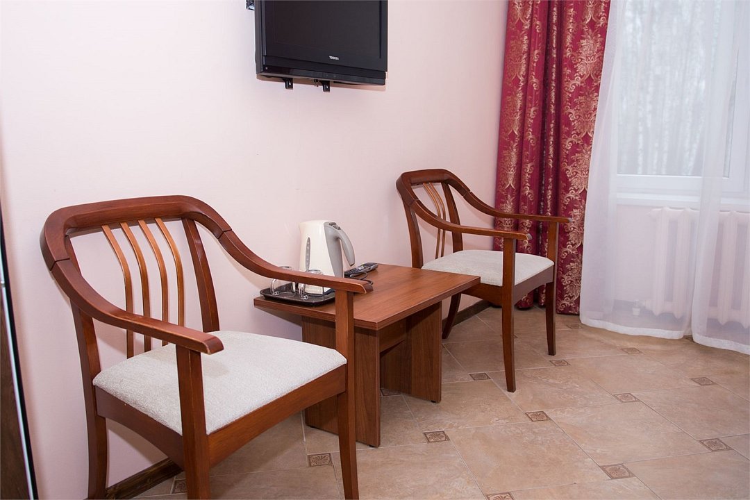 кабельное телевидение, Wi-Fi, фен, ванна, банные полотенца, тапочки, две односпальные кровати, тумбы, стулья, шкаф для одежды, вешалки, багажная тумба, зеркало, обслуживание номеров, чайник, унитаз, раковина, кулер на этаже, стаканы, столовые приборы, стол, внутренний телефон, мини-холодильник, можно с питомцамиВ номере