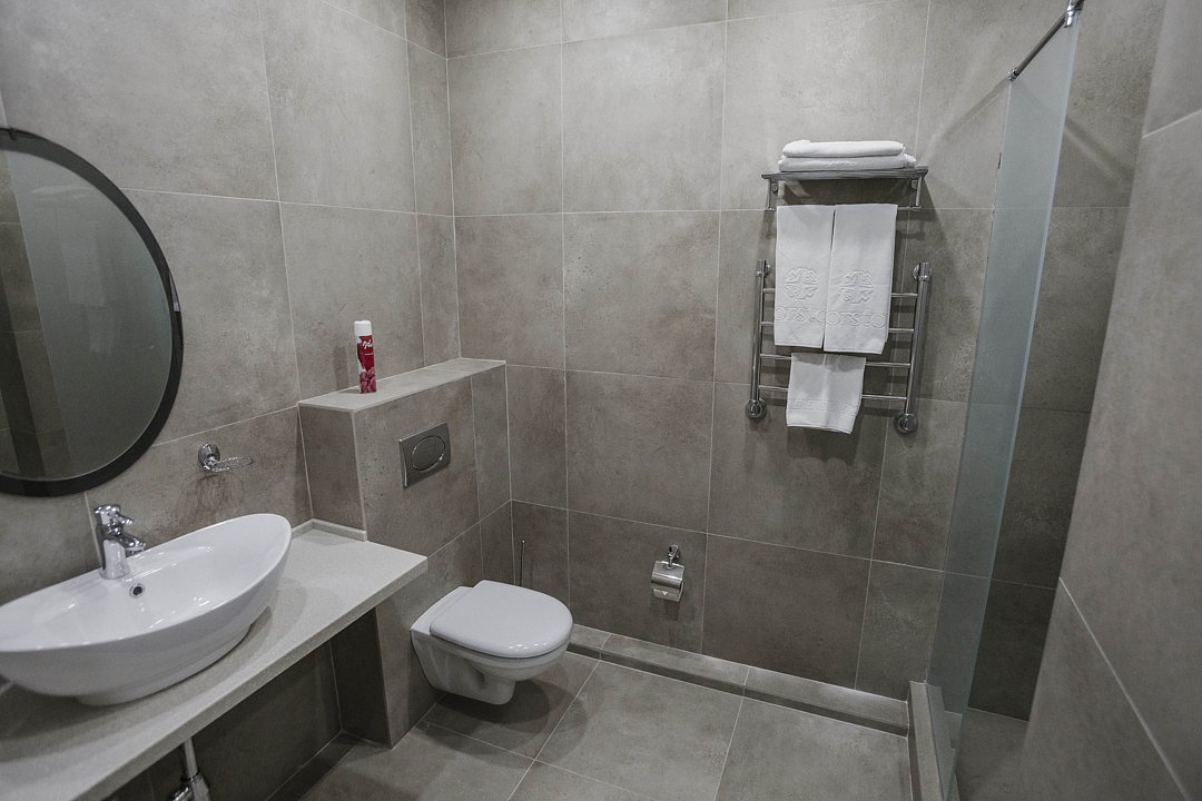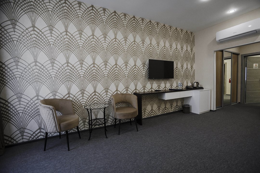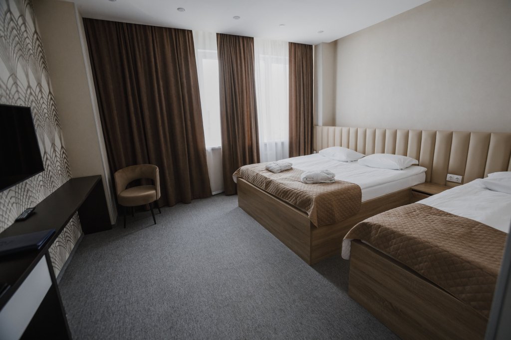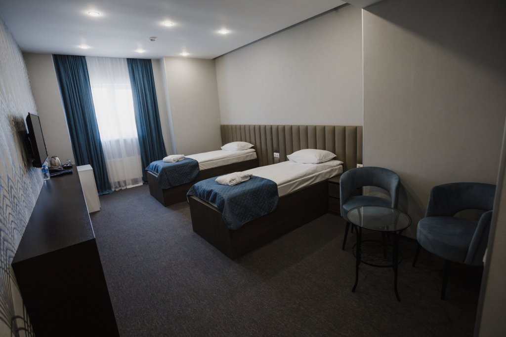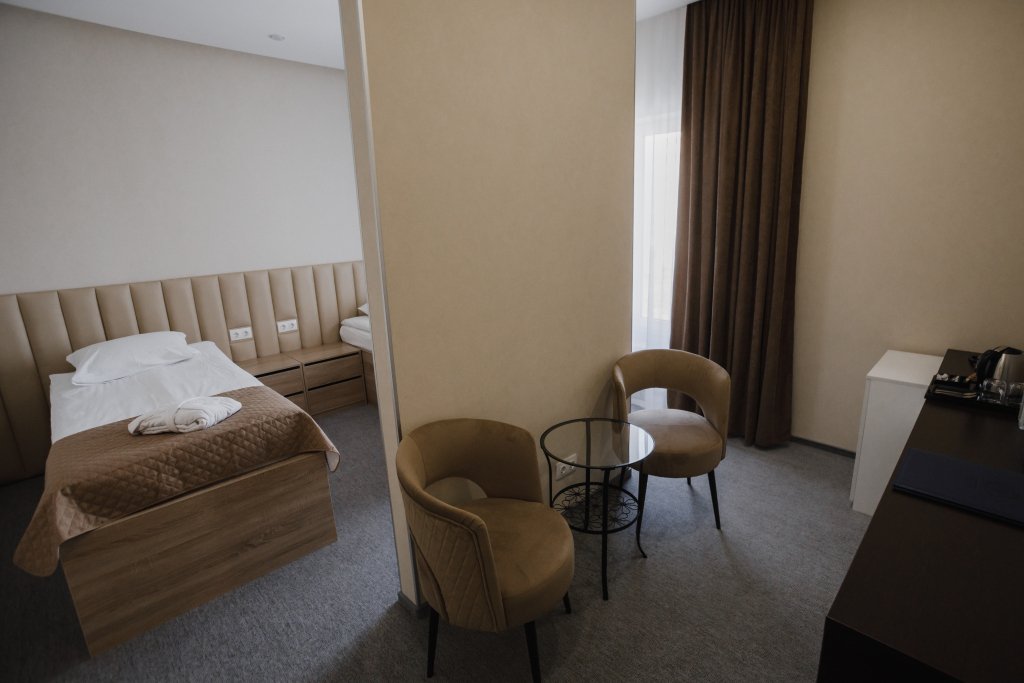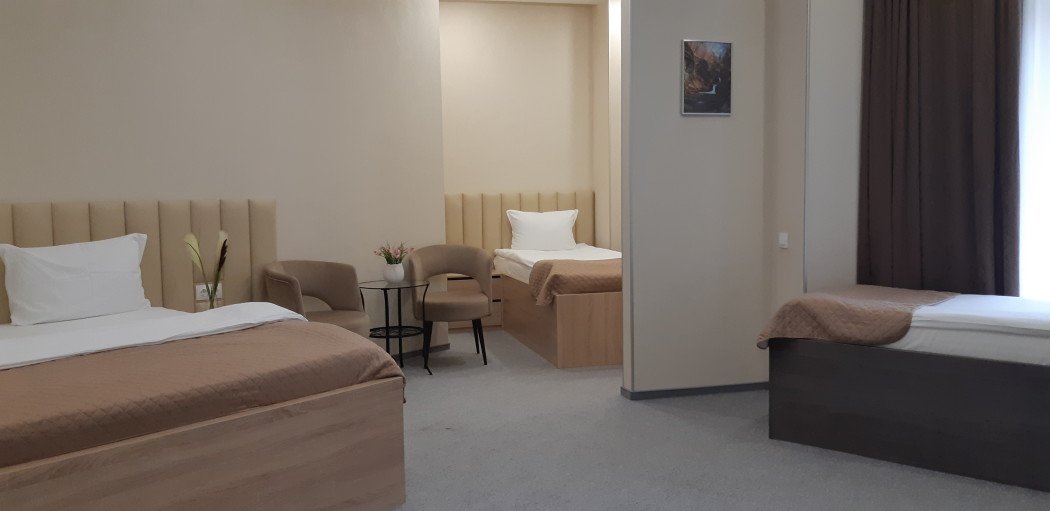 Просторный номер отеля подойдёт для семей с детьми, а так же для командировок и бизнес поездок. Расселение в номере может быть как одноместное, так и двухместное, трехместное, что позволяет семье принять решение остановиться именно в этом номере. В номерах есть все необходимое для комфортного проживания: халаты, тапочки, туалетно-косметические принадлежности, комплект полотенец, чайный набор, бутилированная вода, кондиционер, фен и сейф и конечно же отличный wi-fi.