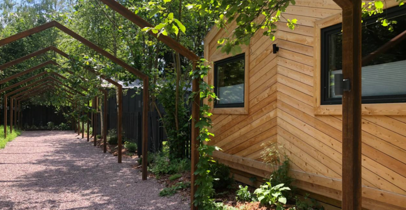 В просторных домиках есть все необходимое для комфортного проживания: гостиная с кухней, спальня, ванна и душевая кабина.