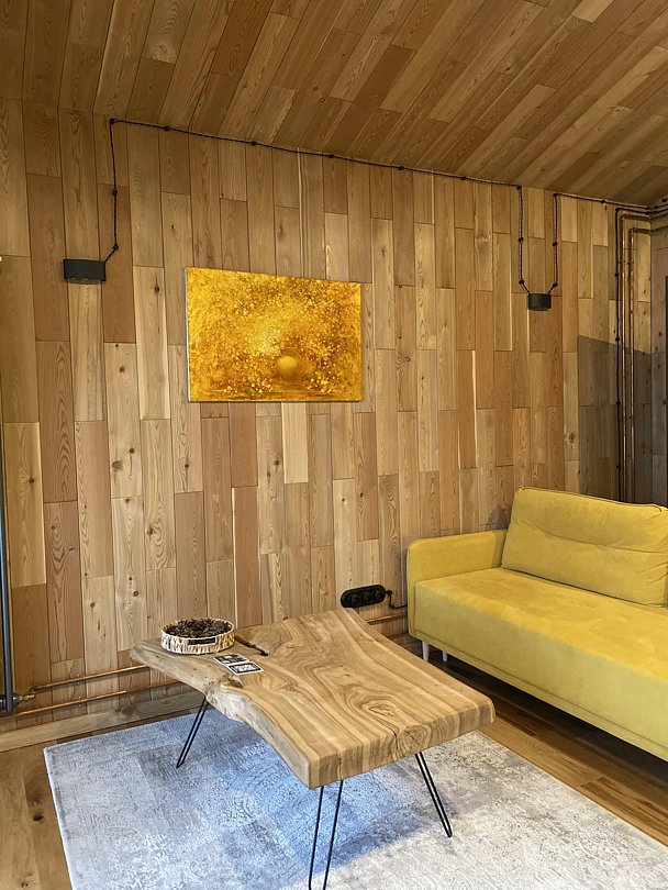 Интерьер выполнен в эко-стиле с использованием эксклюзивных материалов, таких как натуральная паркетная доска и лиственничные стены. Для отопления используются медные трубы; радиаторы сделаны в итальянском дизайне, а проводка — в ретро-стиле. Сантехнические приборы от фирмы Grohe. А благодаря трёхметровым витражным окнам из закалённого стекла открывается панорамный вид на окружающую природу.