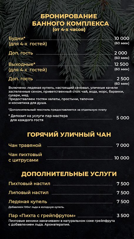 - The Banya, 1 гость — 40000 ₽, 2 гостя — 50000 ₽, 3 гостя — 60000 ₽, 4 гостя — 70000 ₽;