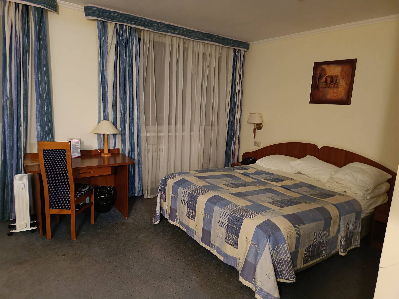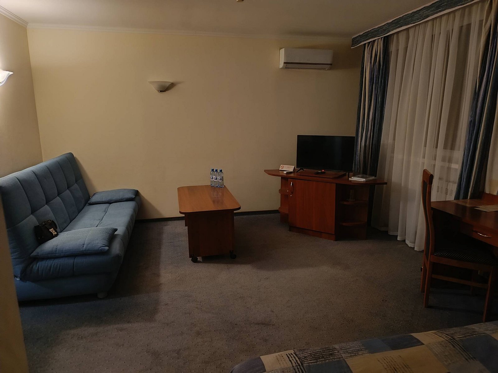 В номере: двуспальная кровать, шкаф-купе, прикроватные тумбочки, телевизор, полка для багажа и обуви, мини-холодильник, телефон, кондиционер.