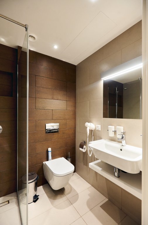 кабельное телевидение, Wi-Fi, кондиционер, светильник, фен, ванная комната, душевая кабина, санузел, банные полотенца, тапочки, гигиенические средства, односпальная кровать, ортопедический матрас, шкаф для одежды, вешалки, зеркало, раковина, отопление, душ, вид на сад, кулер на этаже, вид во двор, ламинат, стаканы, стул, стол, телевизор с плоским экраном, мини-холодильник, москитная сетка, номер для некурящихВ гостиничном номере