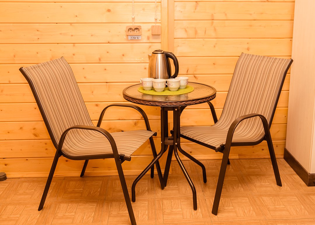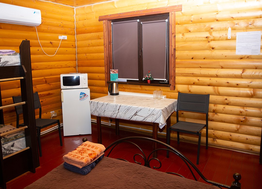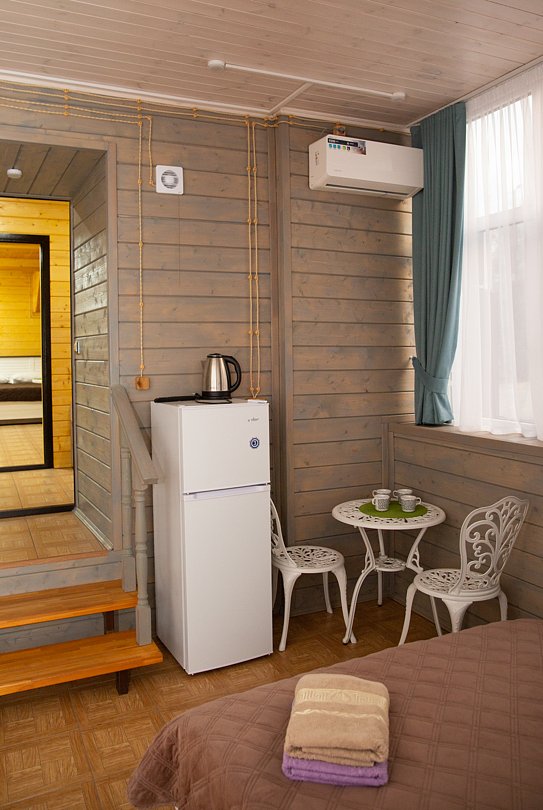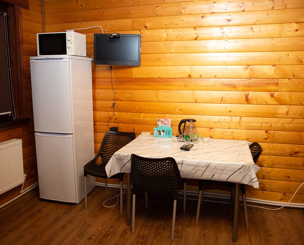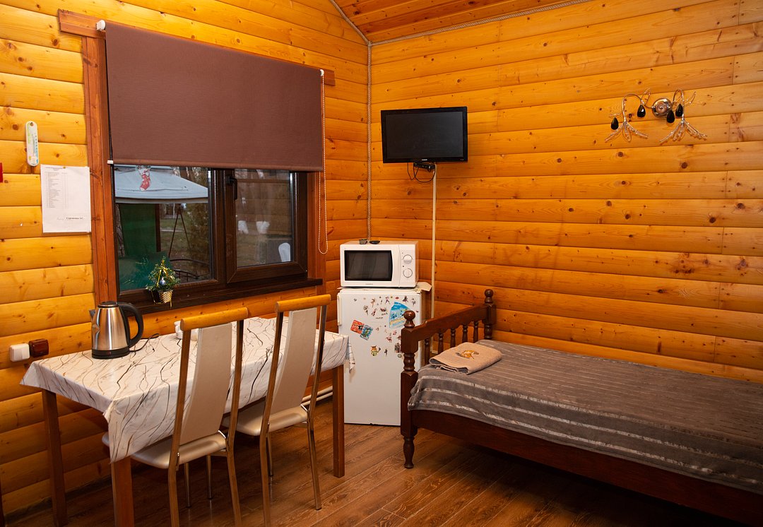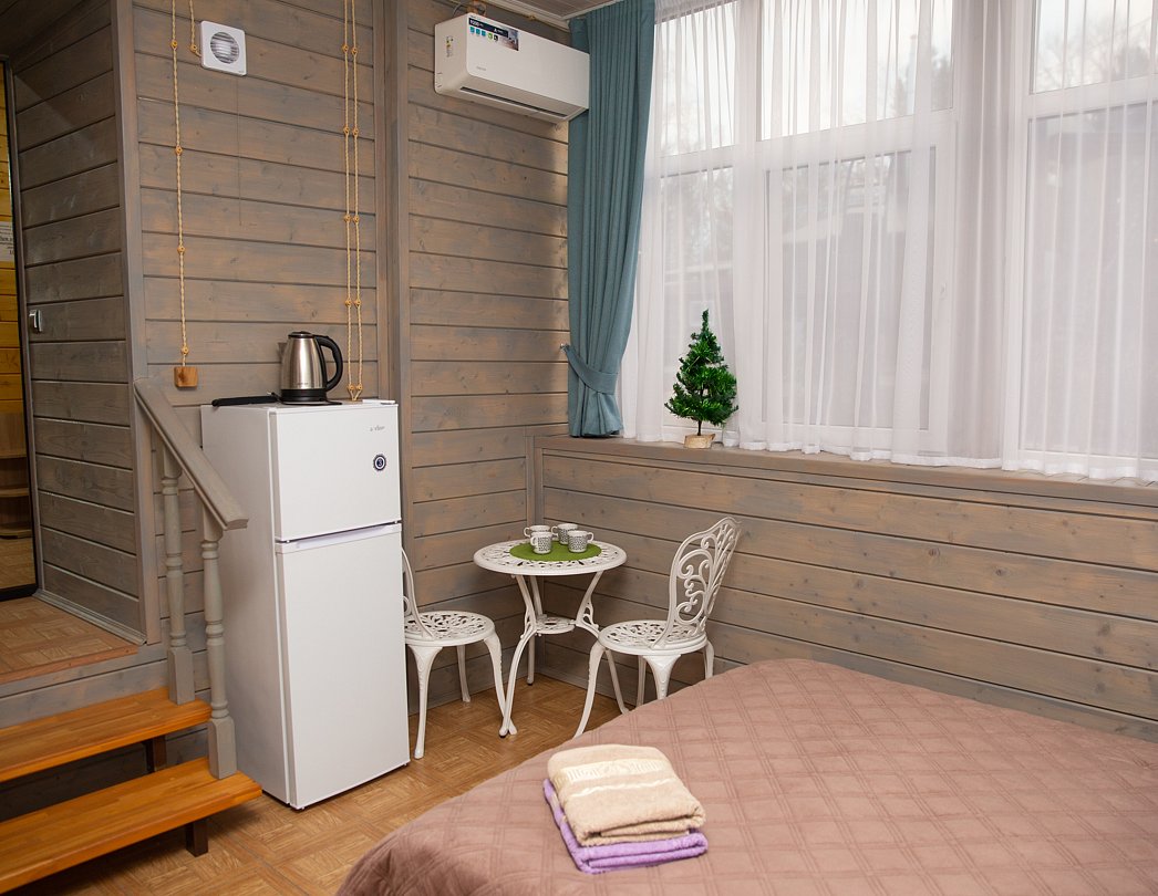 Отдельно стоящий домик включает в себя всю необходимую мебель и технику для комфортного проживания, а также отдельный санузел. Возле каждого домика имеется навес и стол с лавками для комфортного времяпровождения на свежем воздухе.