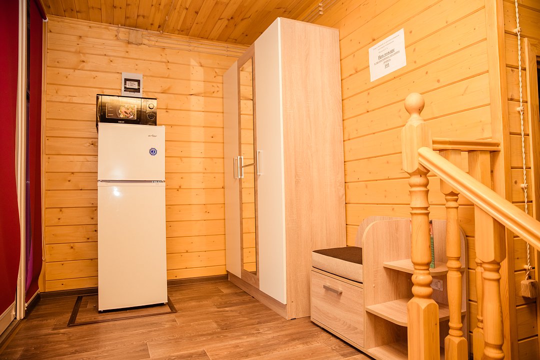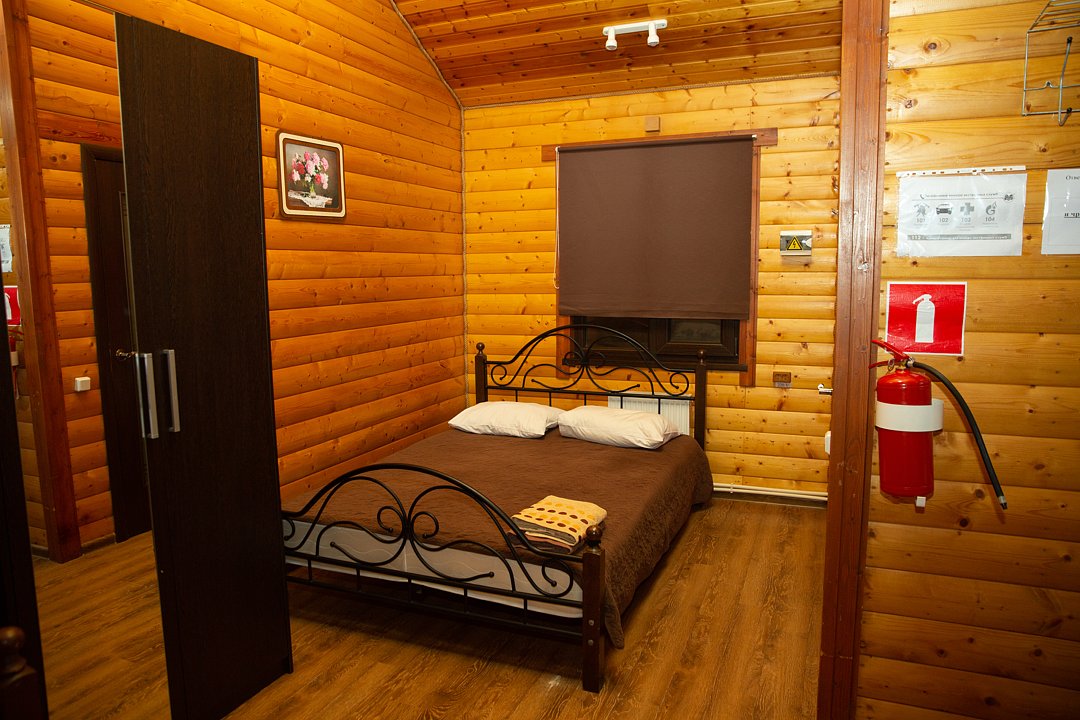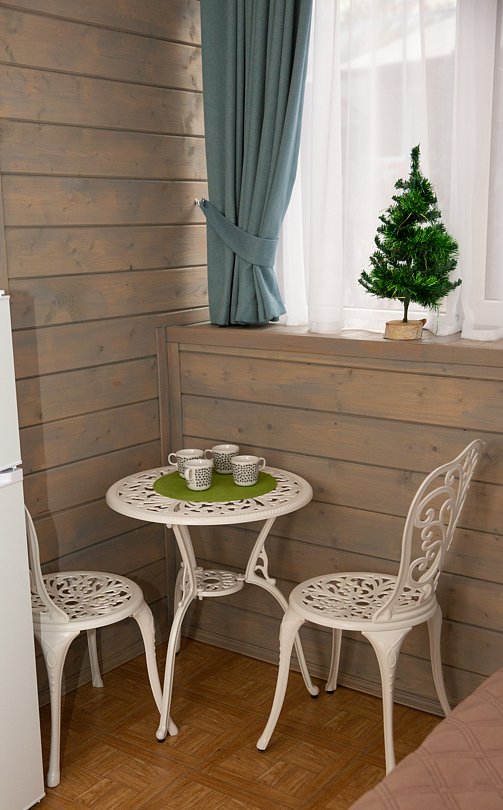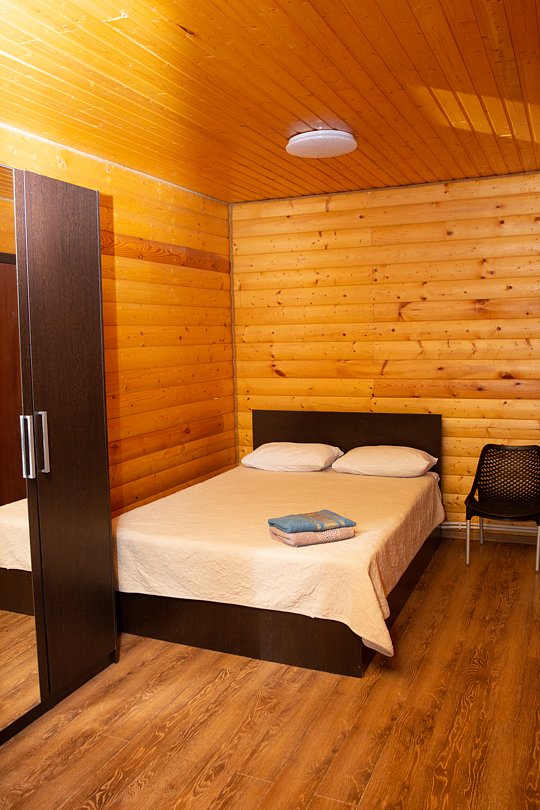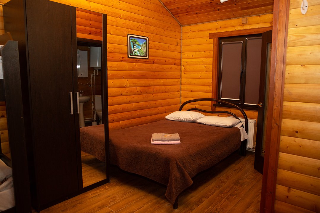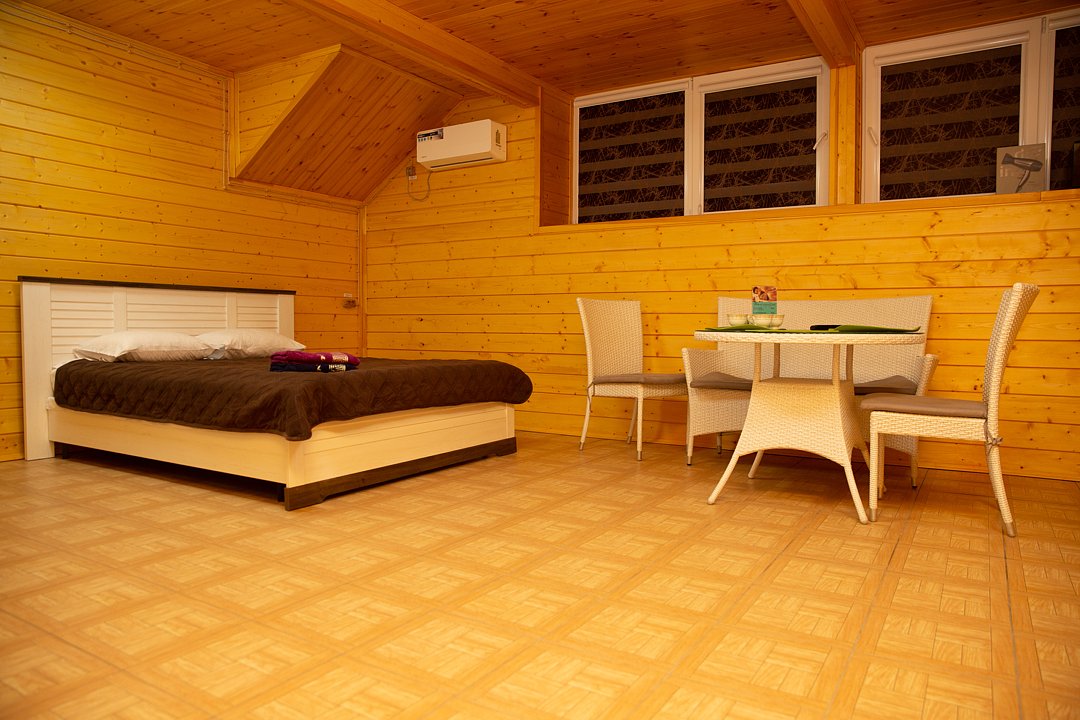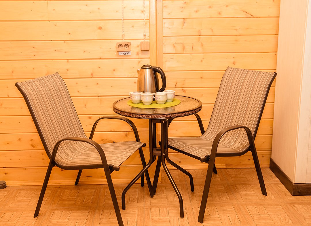 Отдельно стоящий домик включает в себя всю необходимую мебель и технику для комфортного проживания, а также отдельный санузел. Возле каждого домика имеется навес и стол с лавками для комфортного времяпровождения на свежем воздухе.