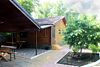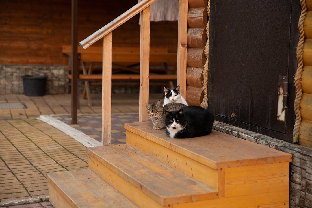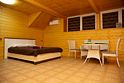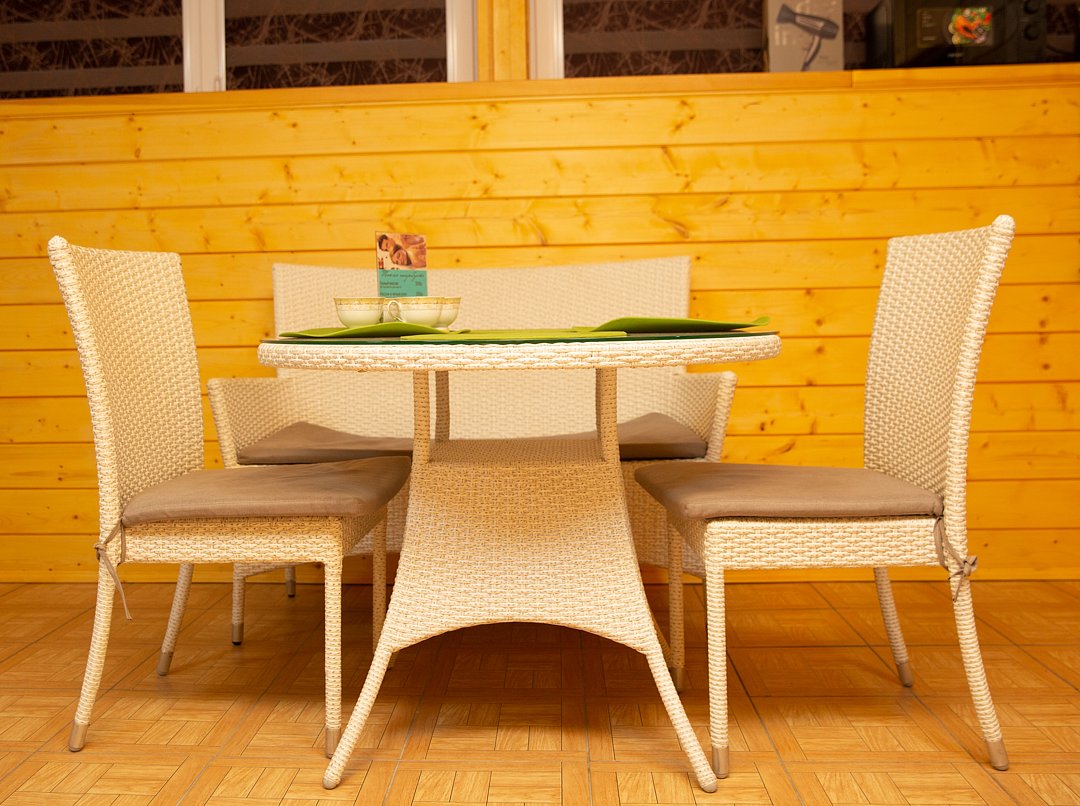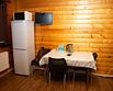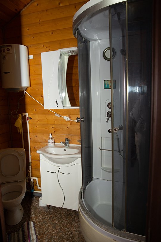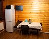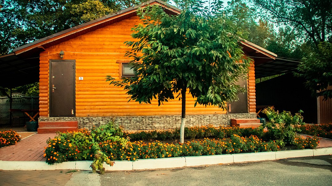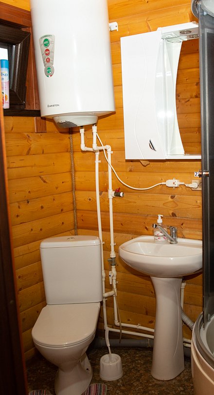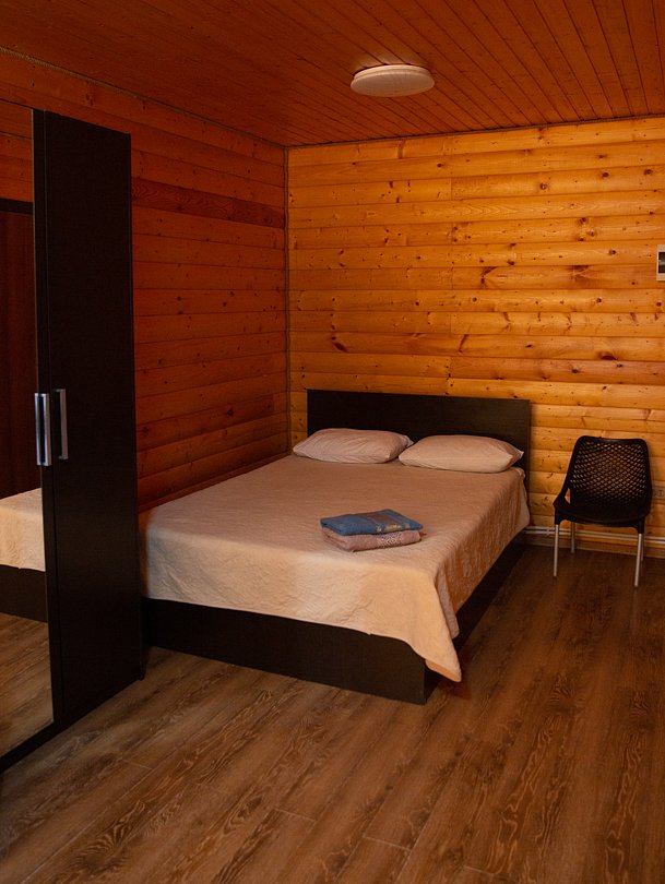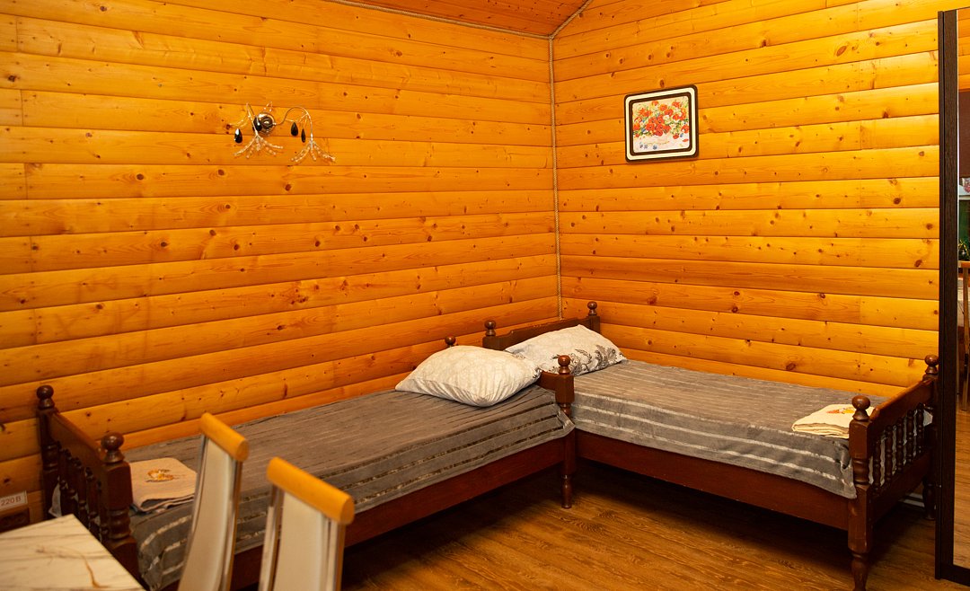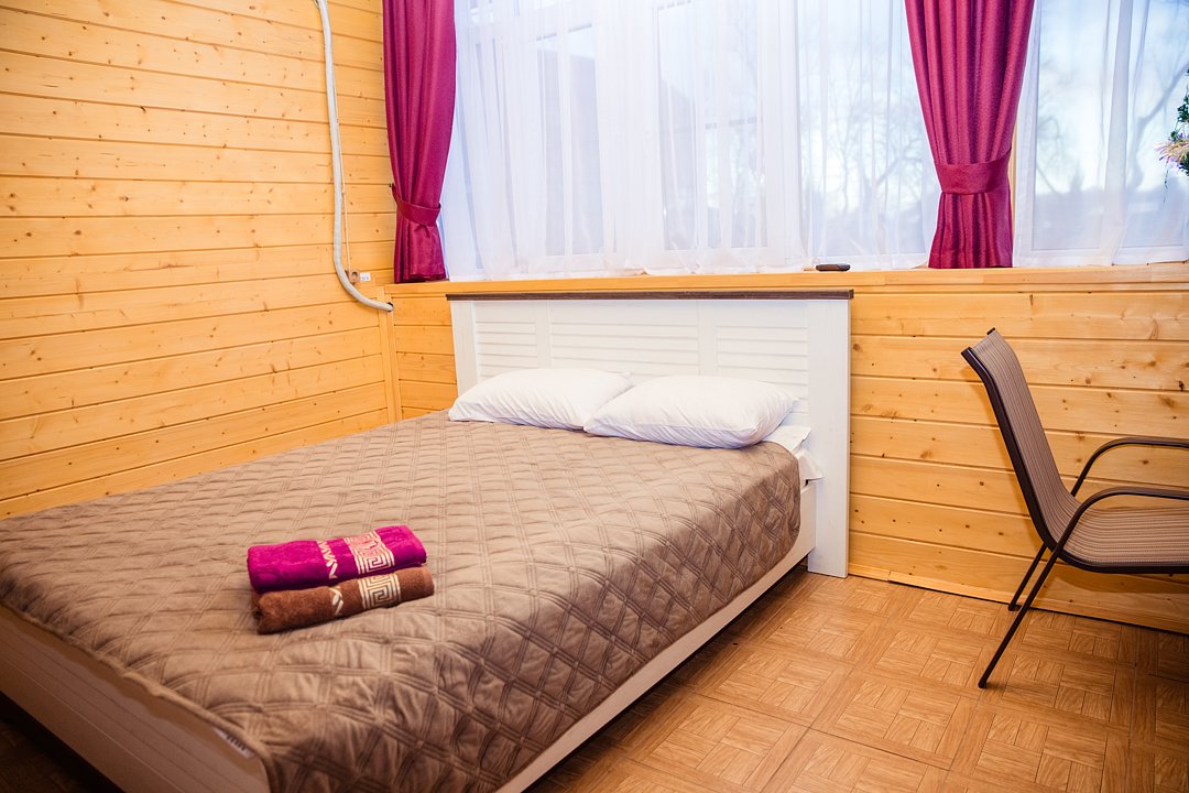 Отдельно стоящий домик включает в себя всю необходимую мебель и технику для комфортного проживания, а также отдельный санузел. Возле каждого домика имеется навес и стол с лавками для комфортного времяпровождения на свежем воздухе.