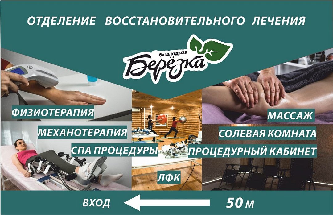 Но «Березка» не только про отдых и развлечение, но и про оздоровление! Поэтому предлагает и новые медицинские услуги по реабилитации после перенесенных заболеваний и травм. У вас будет отличная возможность восстановить здоровье, совмещая полезные процедуры с приятным отдыхом. В ассортименте услуг имеются различные СПА-процедуры, механотерапия, физиотерапия, аква-аэробика, кедровая бочка, солевая комната и массажи.