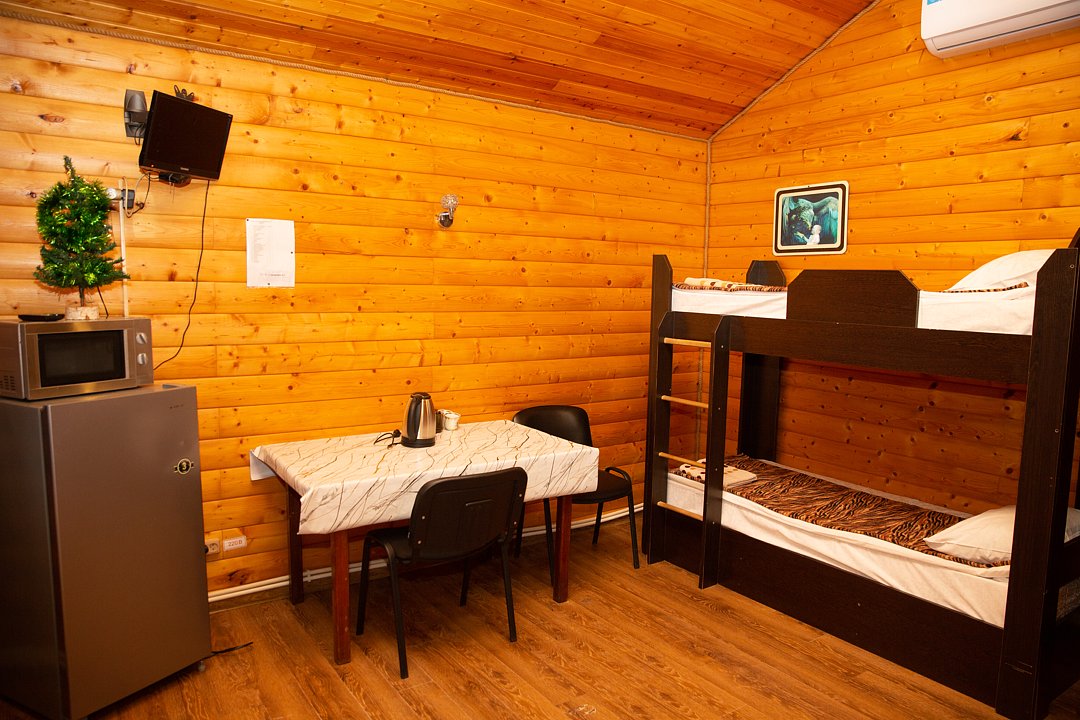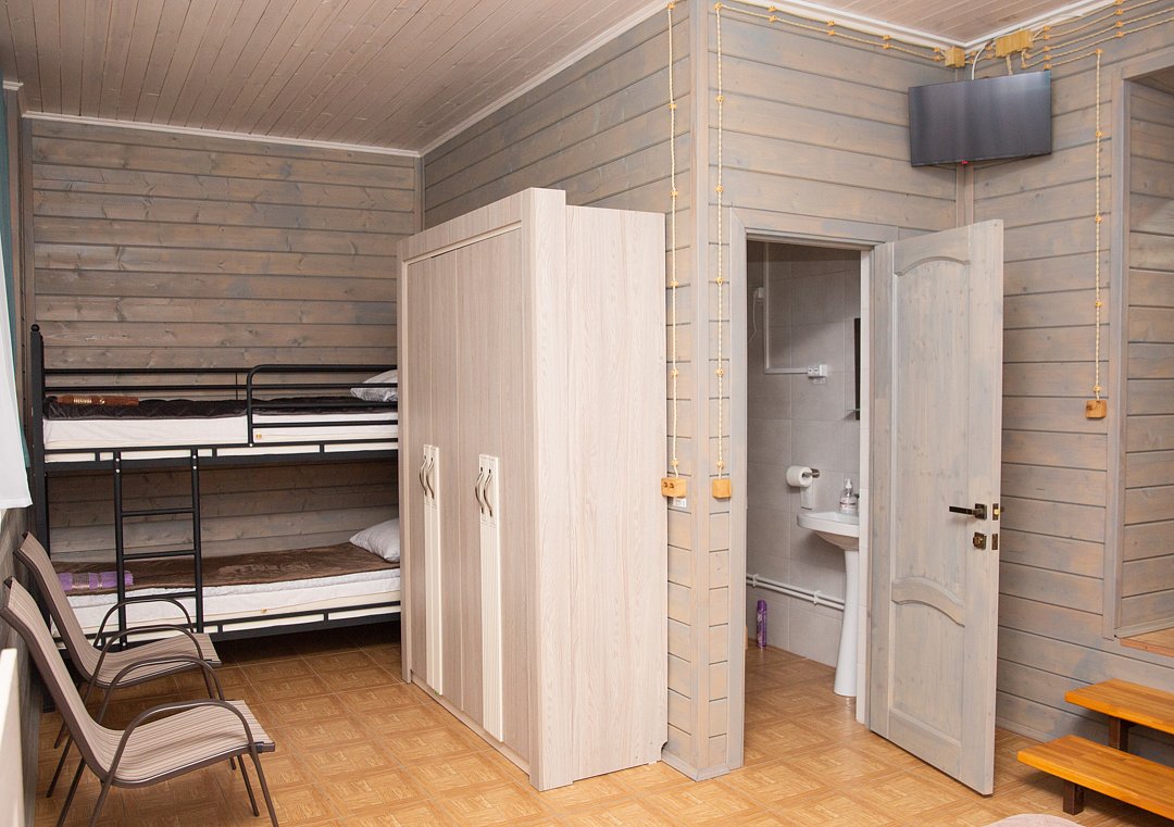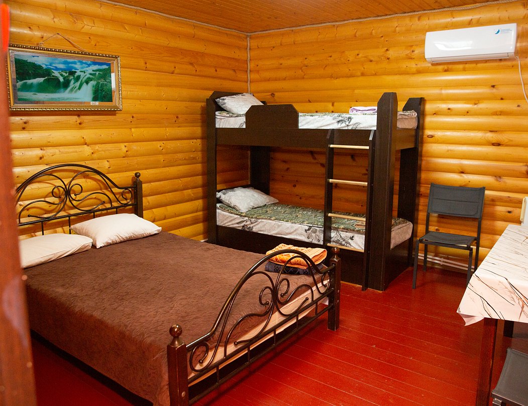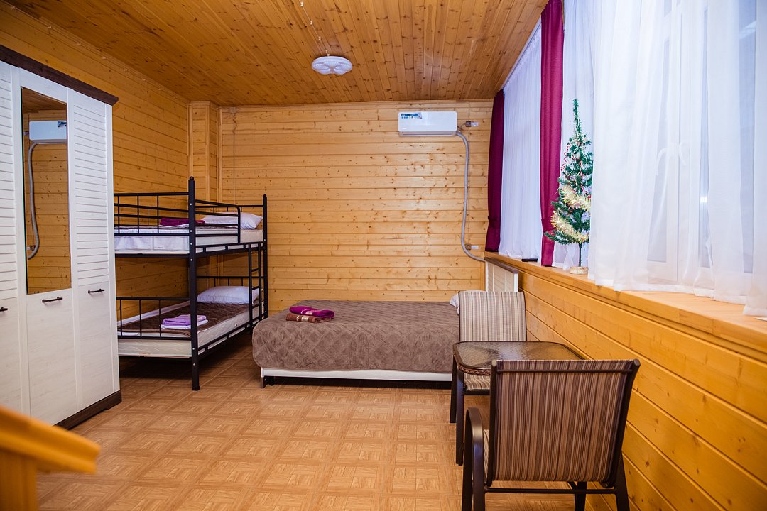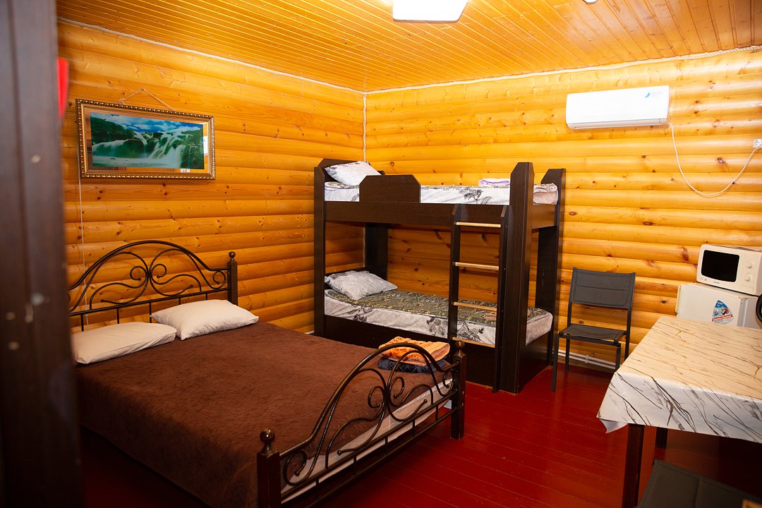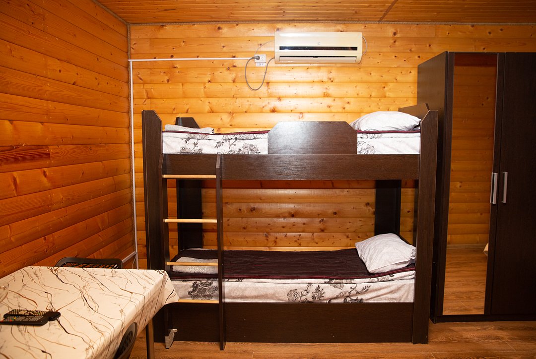 В номере одна двуспальная кровать и одна двухъярусная кровать. Свежее чистое постельное и полотенца. А так же кондиционер, телевизор, холодильник, микроволновая печь, чайник. Номер оснащен отдельным санузлом. Wi-Fi в номере.