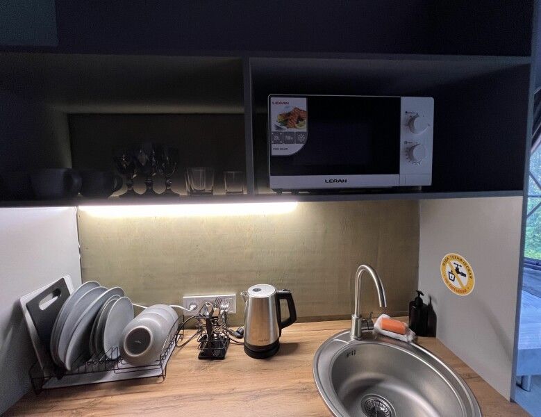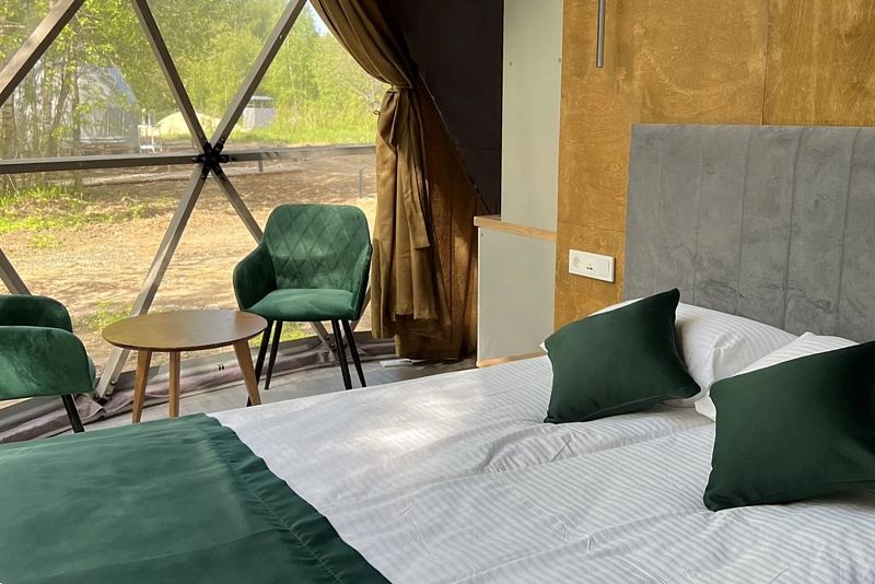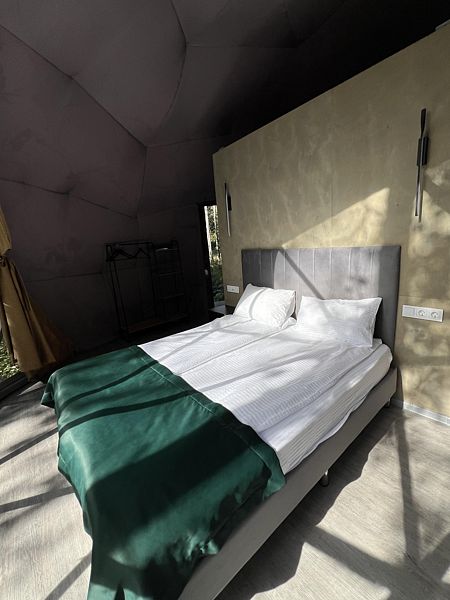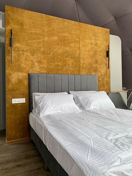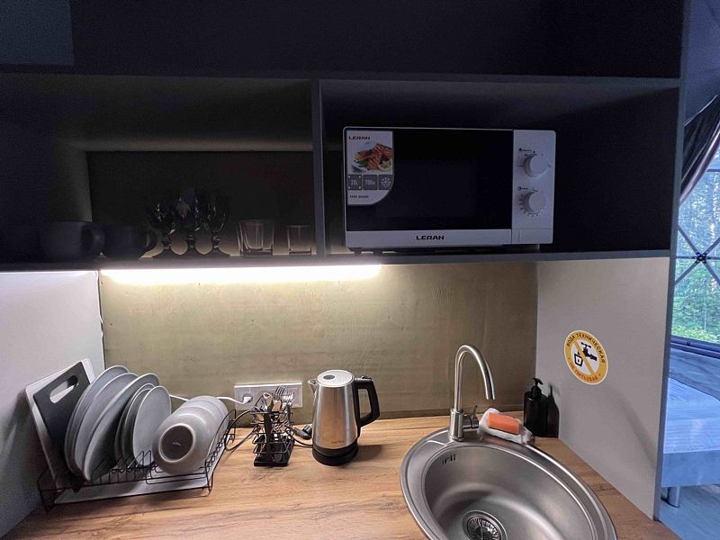 Уютная сфера оборудована всем необходимым для комфортного проживания. Здесь есть система климат-контроля, обогреватель и, при необходимости, детская кроватка. Ванная комната с душем, феном и туалетными принадлежностями обеспечит приятные водные процедуры. Кухонная зона полностью укомплектована — от микроволновки и холодильника до чайника и посуды, позволяя гостям готовить самостоятельно.