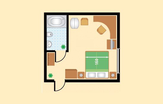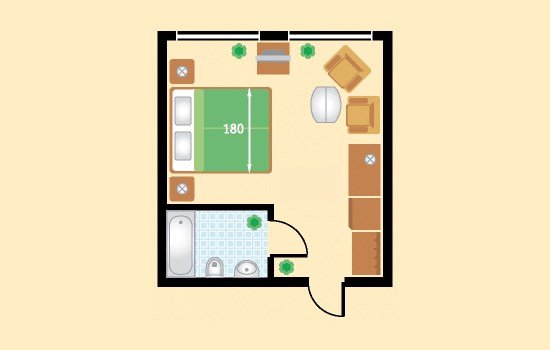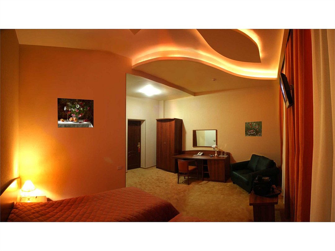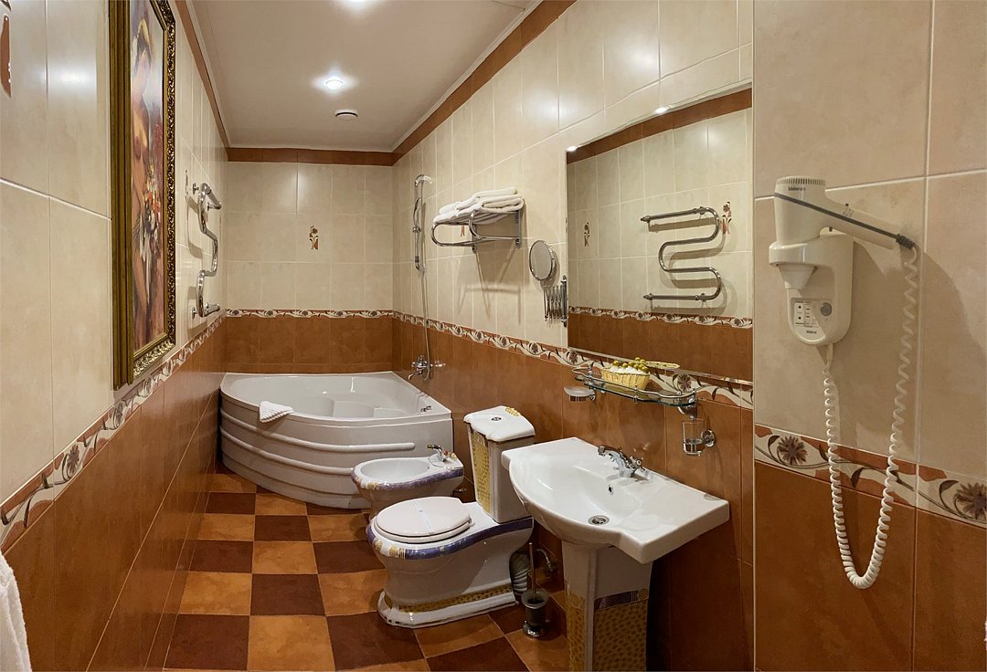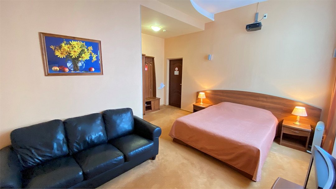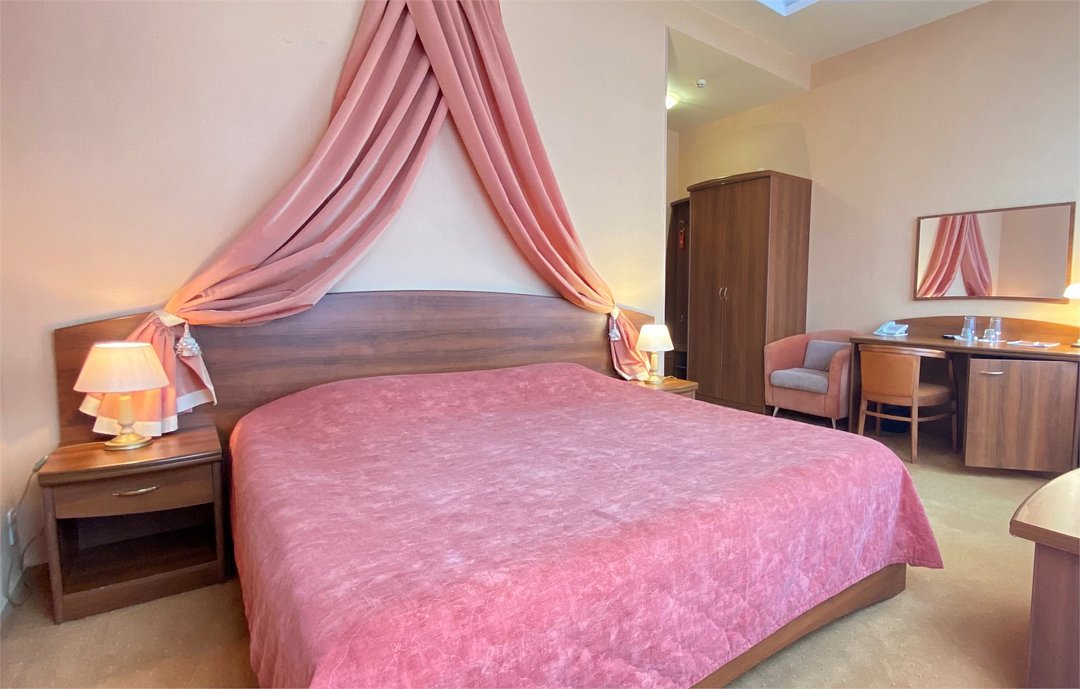 телевизор, Wi-Fi, телефон, кондиционер, фен, гидромассажная ванна, халаты, банные полотенца, тапочки, двуспальная кровать, шкаф для одежды, журнальный столик, багажная тумба, мини-бар, сейф, ковровое покрытие, кулер на этаже, кресло, вид во двор, меню подушек, стол, гостиничная парфюмерия, проектор, без питомцевВ номере