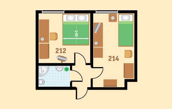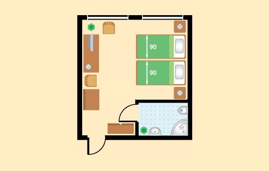 телевизор, Wi-Fi, телефон, фен, электронные замки, ванная комната, душевая кабина, банные полотенца, две односпальные кровати, шкаф для одежды, багажная тумба, мини-бар, ковровое покрытие, кресло, вид во двор, меню подушек, без питомцевВ номере