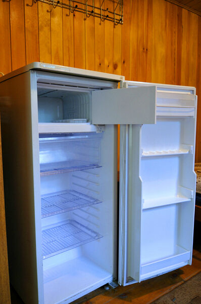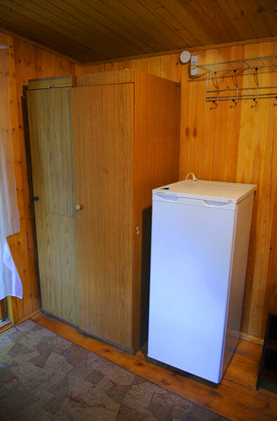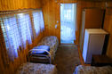 Холодильник, телевизор, стол и стулья, шкаф, тумбочка, зеркало.В доме