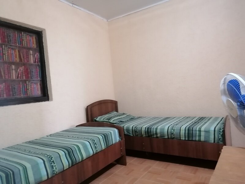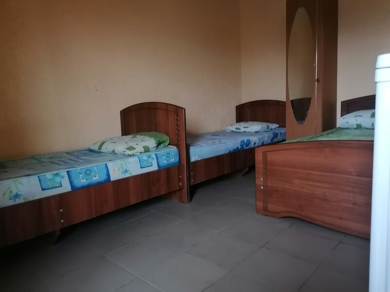 Кровать двуспальная и односпальная, тумбочки прикроватные, санузел (душ+туалет) на территории.