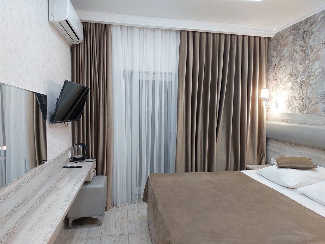 Wi-Fi, светильник, фен, обогреватель, банные полотенца, балкон, двуспальная кровать, тумбы, шкаф для одежды, зеркало, унитаз, раковина, ламинат, туалетный столик, туалетный столик, туалет, сплит-система, мини-холодильник, телевизор со Smart TV, номер для некурящих, пуфик, уборка номера, мыло, затемняющая штора, можно с питомцамиВ гостиничном номере