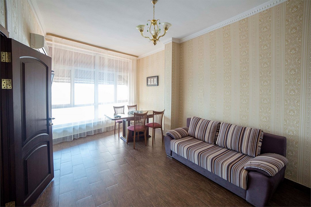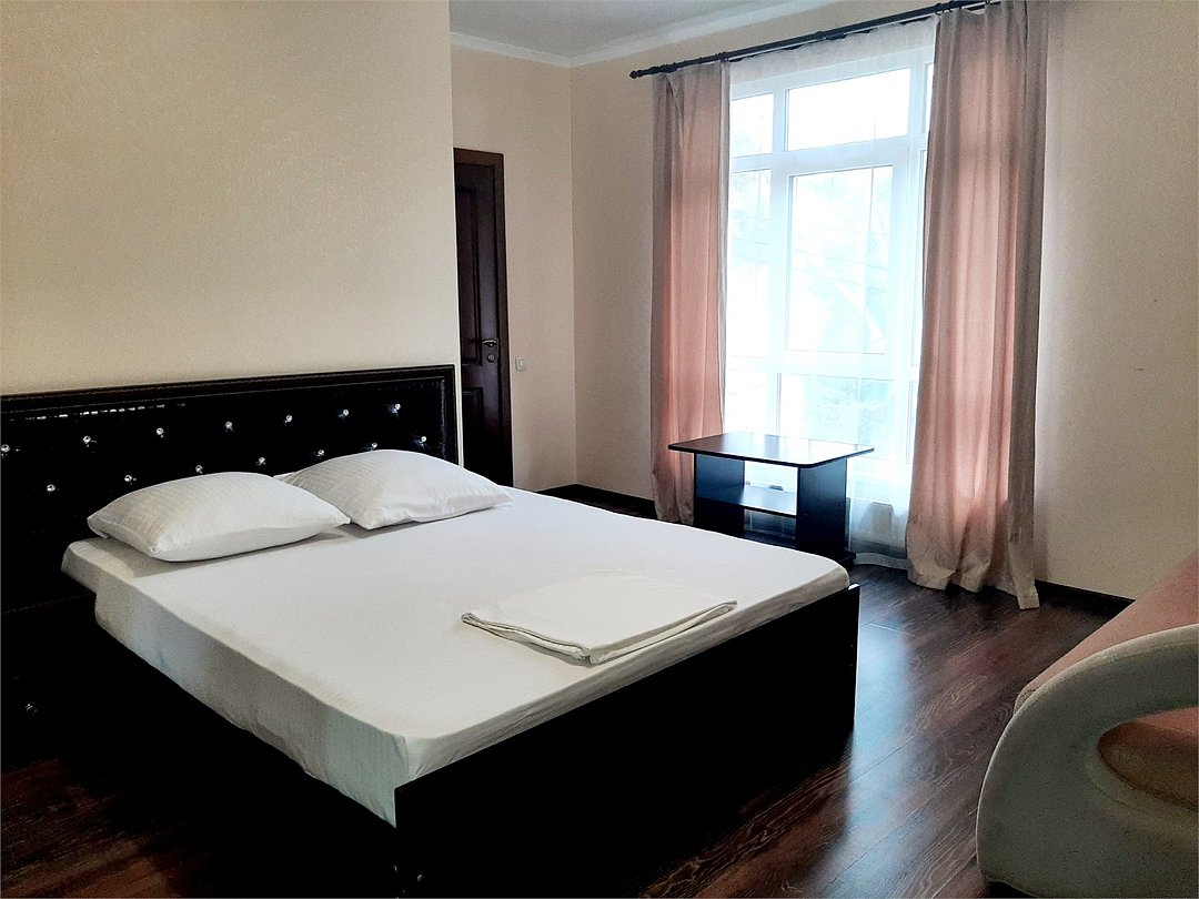 Номер площадью 40 кв. м с видом на море. Подходит для размещения 6 человек. (4 основных места и 2 дополнительных) Имеет 2 спальни с приятным интерьером. В номере: 2 двуспальные кровати, 1 двуспальный диван. Имеется телевизор, кондиционер, шкаф, вешалка, зеркало, журнальный столик, стулья, собственная кухня со всей необходимой техникой. Индивидуальная ванная комната: душ, раковина, туалет. В стоимость входит: Постельное бельё, полотенца, мыло. WI-Fi бесплатно на всей территории.Услуги и удобства