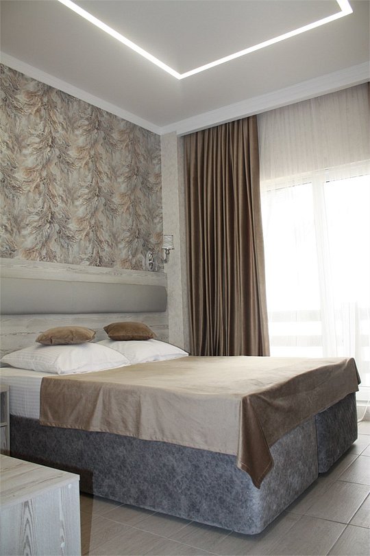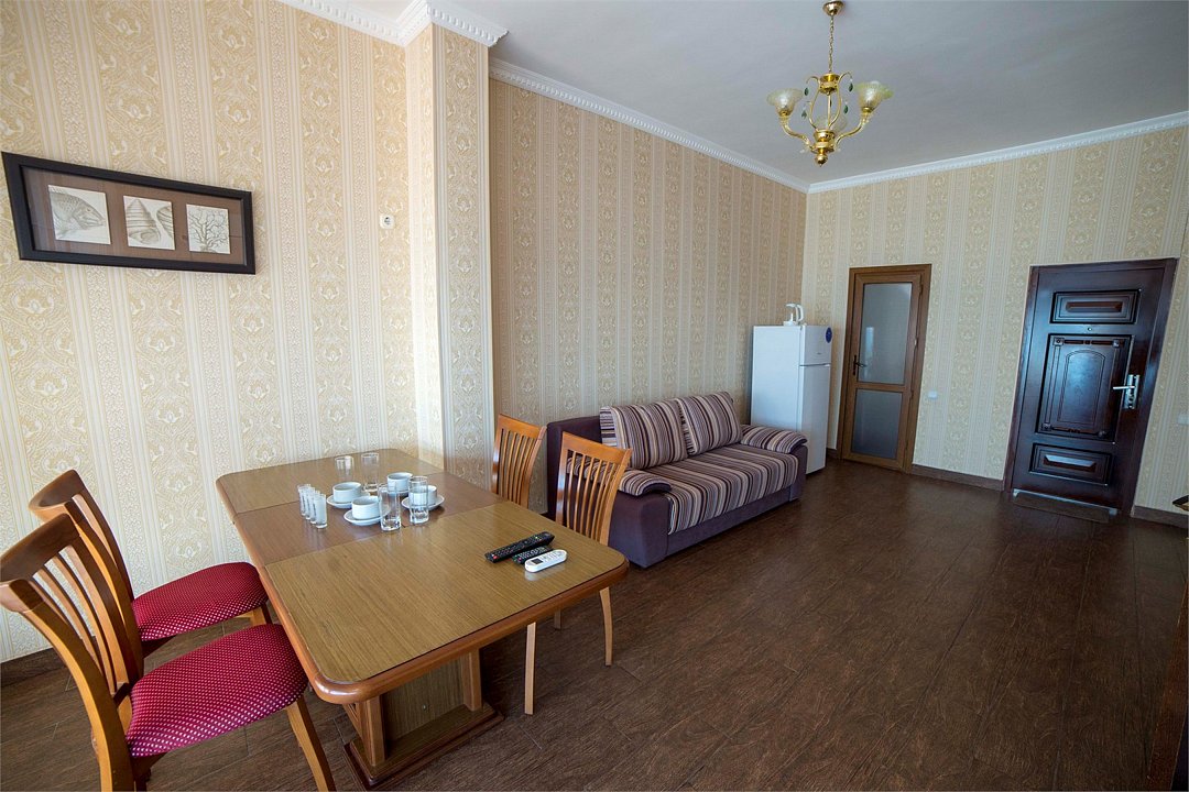 Семейный номер площадью 35 кв.м с частичным видом на море. Подходит для размещения 6 человек. (5 основных места и 1 дополнительное). Имеет спальню с приятным интерьером и гостиную. В номере: 1 двуспальная кровать, 2 односпальные кровати, 1 односпальный диван. Имеется телевизор, кондиционер, шкаф, вешалка, рабочий стол, стулья, холодильник. Индивидуальная ванная комната: душ, раковина, туалет. В стоимость входит: Постельное бельё, полотенца, мыло. WI-Fi бесплатно на всей территории. Бесплатная общественная парковка на территорией.Услуги и удобства
