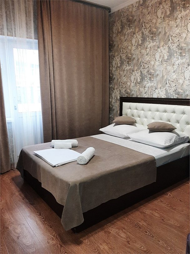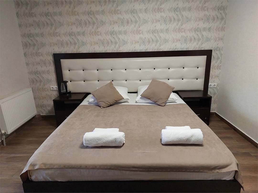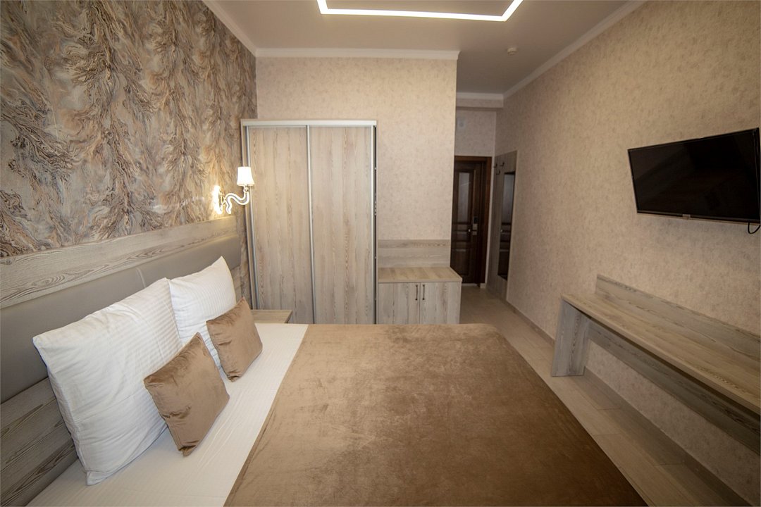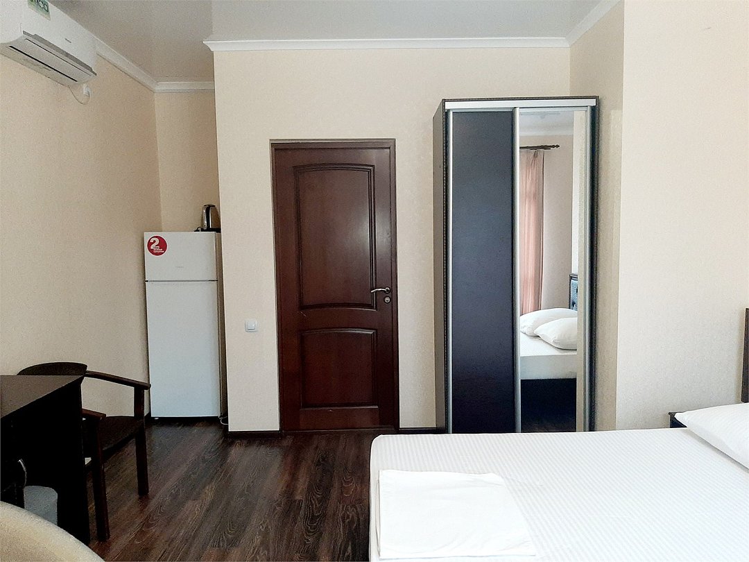 Двухместный стандартный номер площадью 18 кв.м. Подходит для размещения 2 человек. Имеет спальню с приятным интерьером. В номере: 1 двуспальная кровать. Имеется телевизор, кондиционер, шкаф, вешалка, рабочий стол, стулья, холодильник. Индивидуальная ванная комната: душ, раковина, туалет. В стоимость входит: Постельное бельё, полотенца, мыло. WI-Fi бесплатно на всей территории. Бесплатная общественная парковка на территорией.Услуги и удобства