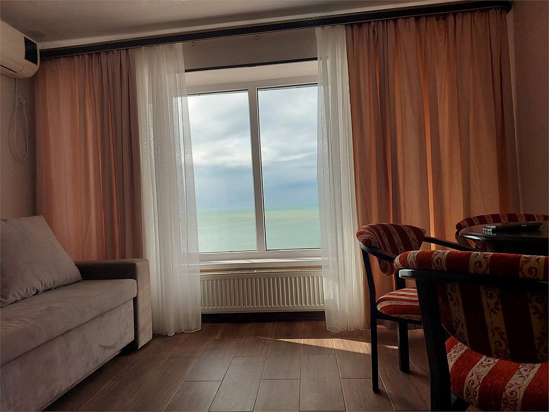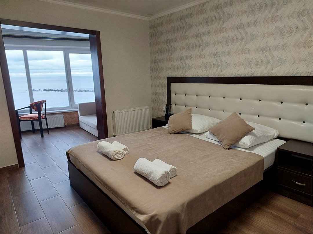 Номер Люкс площадью 27 кв. м с видом на море. Подходит для размещения 5 человек (4 основных места и 1 дополнительное) Имеет спальню и гостиную с приятным интерьером. В номере: 1 двуспальная кровать, 1 двуспальный диван. Имеется телевизор, кондиционер, шкаф, вешалка, рабочий стол, стулья, холодильник. Индивидуальная ванная комната: душ, раковина, туалет. В стоимость входит: Постельное бельё, полотенца, мыло. WI-Fi бесплатно на всей территории.Услуги и удобства